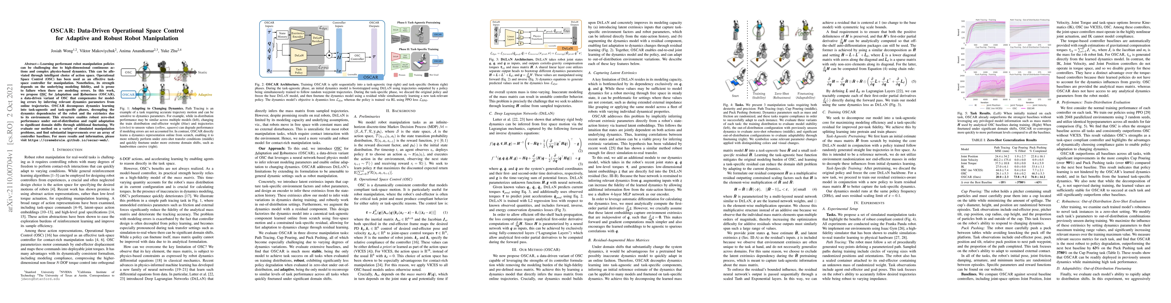 Learning performant robot manipulation policies can be challenging due to high-dimensional continuous actions and complex physics-based dynamics. This can be alleviated through intelligent choice of action space. Operational Space Control (OSC) has been used as an effective task-space controller for manipulation. Nonetheless, its strength depends on the underlying modeling fidelity, and is prone to failure when there are modeling errors. In this work, we propose OSC for Adaptation and Robustness (OSCAR), a data-driven variant of OSC that compensates for modeling errors by inferring relevant dynamics parameters from online trajectories. OSCAR decomposes dynamics learning into task-agnostic and task-specific phases, decoupling the dynamics dependencies of the robot and the extrinsics due to its environment. This structure enables robust zero-shot performance under out-of-distribution and rapid adaptation to significant domain shifts through additional finetuning. We evaluate our method on a variety of simulated manipulation problems, and find substantial improvements over an array of controller baselines. For more results and information, please visit https://cremebrule.github.io/oscar-web/.
