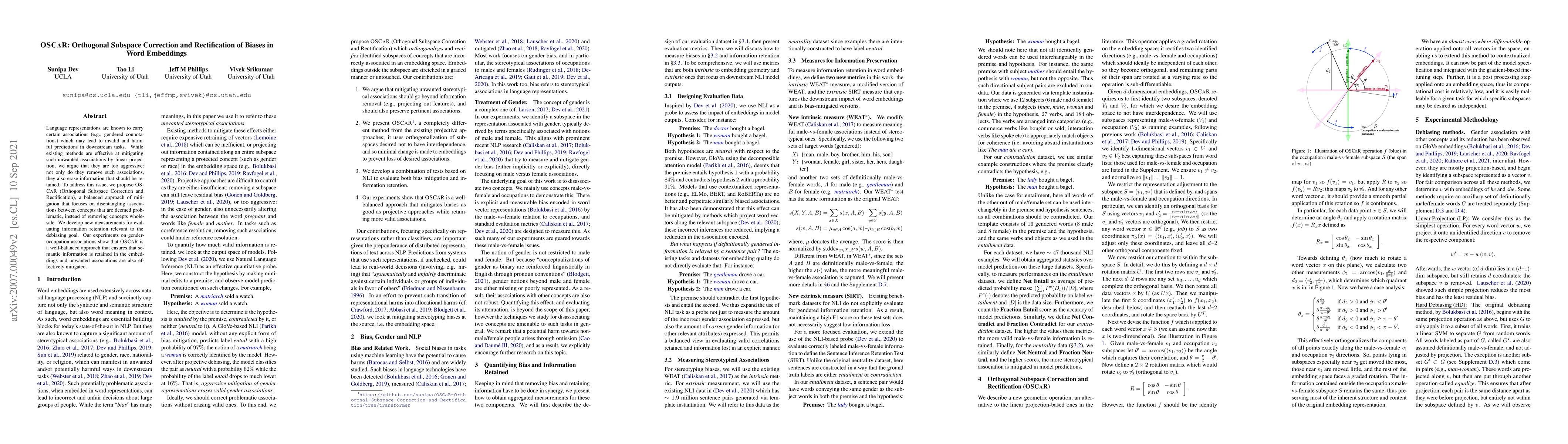 OSCaR is a novel method for mitigating biases in word embeddings by disentangling biased associations without erasing valuable information. Experiments demonstrate that OSCaR effectively reduces gender biases while maintaining semantic integrity.