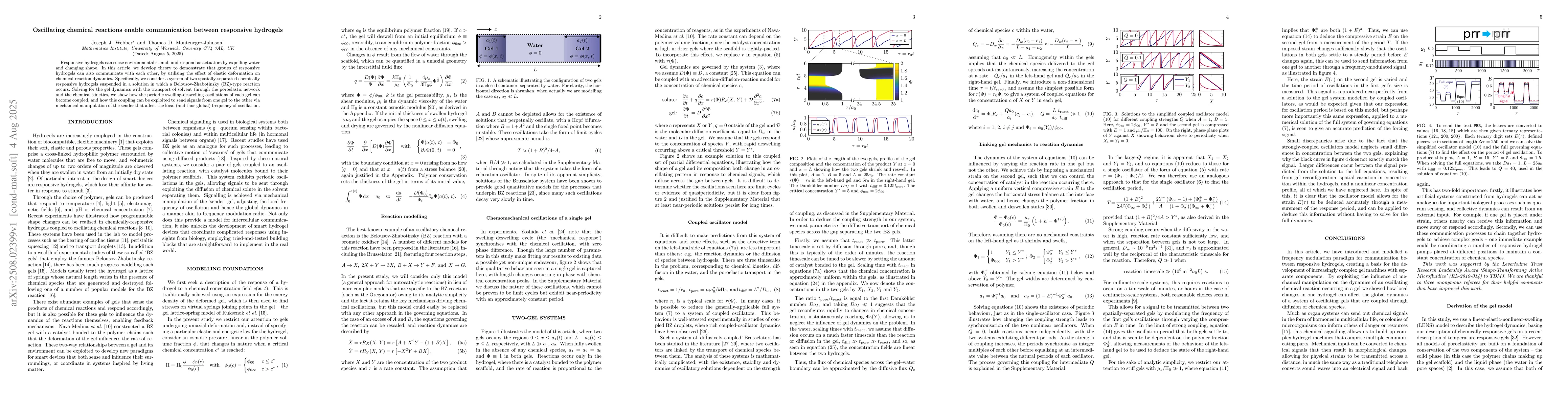 Responsive hydrogels can sense environmental stimuli and respond as actuators by expelling water and changing shape. In this article, we develop theory to demonstrate that groups of responsive hydrogels can also communicate with each other, by utilising the effect of elastic deformation on chemical reaction dynamics. Specifically, we consider a system of two spatially-separated chemically responsive hydrogels suspended in a solution in which a Belousov-Zhabotinsky (BZ)-type reaction occurs. Solving for the gel dynamics with the transport of solvent through the poroelastic network and the chemical kinetics, we show how the periodic swelling-deswelling oscillations of each gel can become coupled, and how this coupling can be exploited to send signals from one gel to the other via mechanical manipulation of the sender that affect the local (and thus global) frequency of oscillation.