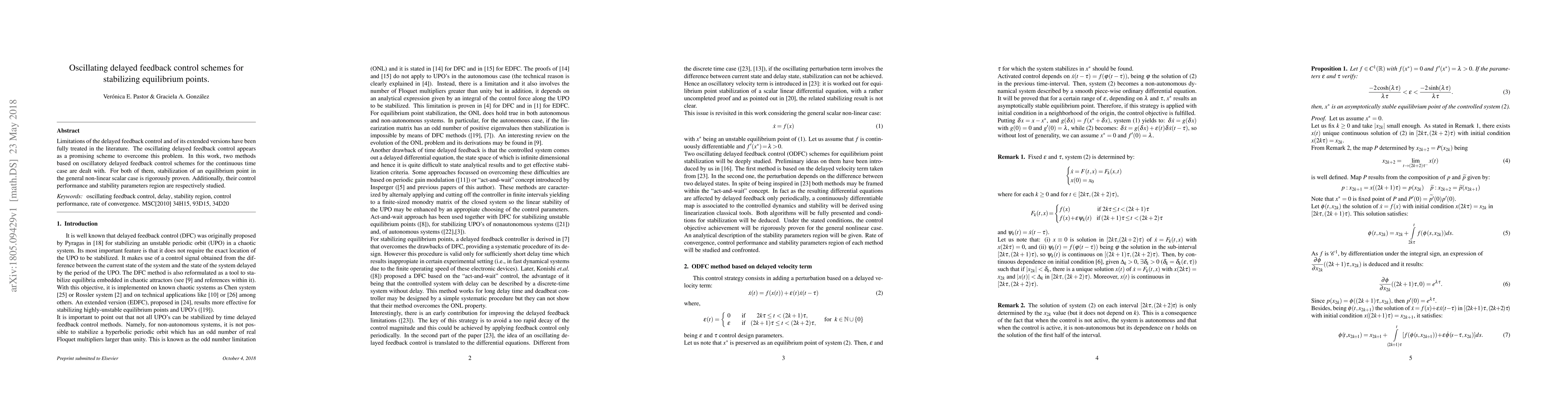This paper proposes two oscillatory delayed feedback control methods for stabilizing equilibrium points in non-linear scalar systems. Both methods rigorously prove stabilization and analyze their performance and stability parameters.