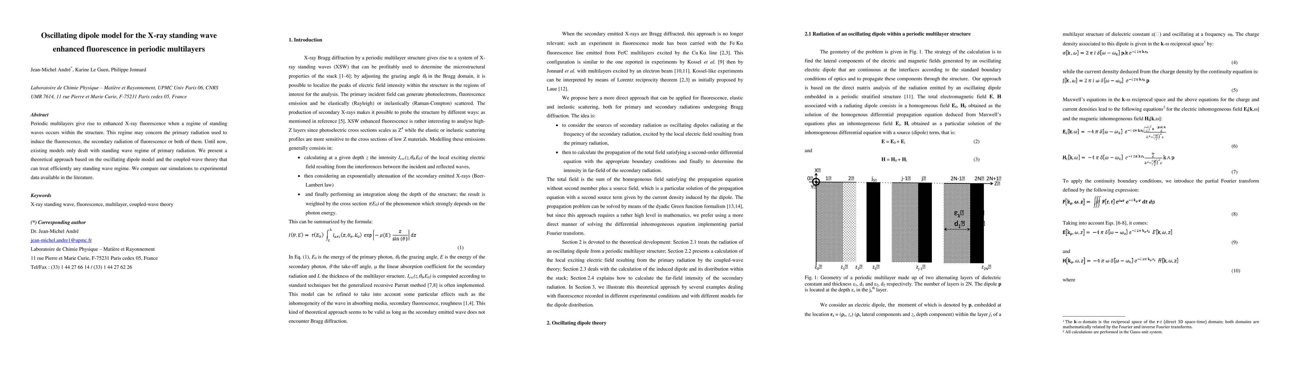 This paper introduces a theoretical oscillating dipole model combined with coupled-wave theory to efficiently analyze the standing wave regime in periodic multilayers, enhancing X-ray fluorescence. The model addresses both primary and secondary radiation regimes, providing a comprehensive approach validated against experimental data.