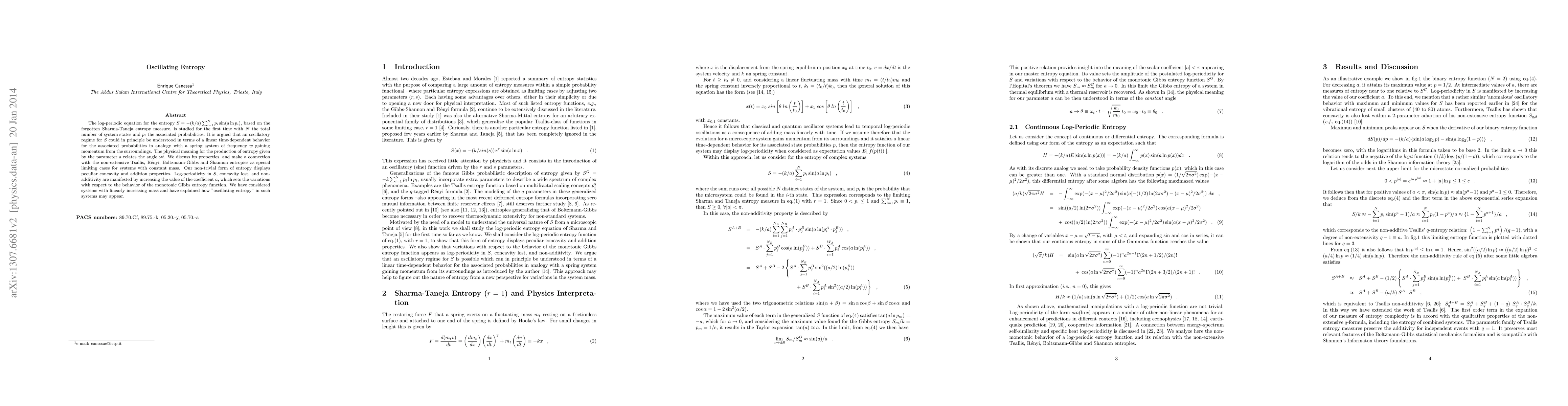 The log-periodic equation for the entropy $S = - (k/a) \sum_{i=1}^{N} p_{i} \sin(a \ln p_{i})$, based on the forgotten Sharma-Taneja entropy measure, is studied for the first time with $N$ the total number of system states and $p_{i}$ the associated probabilities. It is argued that an oscillatory regime for $S$ could in principle be understood in terms of a linear time-dependent behavior for the associated probabilities in analogy with a spring system of frequency $w$ gaining momentum from the surroundings. The physical meaning for the production of entropy given by the parameter $a$ relates the angle $\omega t$. We discuss its properties, and make a connection with the non-extensive Tsallis, R\'{e}nyi, Boltzmann-Gibbs and Shannon entropies as special limiting cases for systems with constant mass. Our non-trivial form of entropy displays peculiar concavity and addition properties. Log-periodicity in $S$, concavity lost, and non-additivity are manifested by increasing the value of the coefficient $a$, which sets the variations with respect to the behavior of the monotonic Gibbs entropy function. We have considered systems with linearly increasing mass and have explained how "oscillating entropy" in such systems may appear.