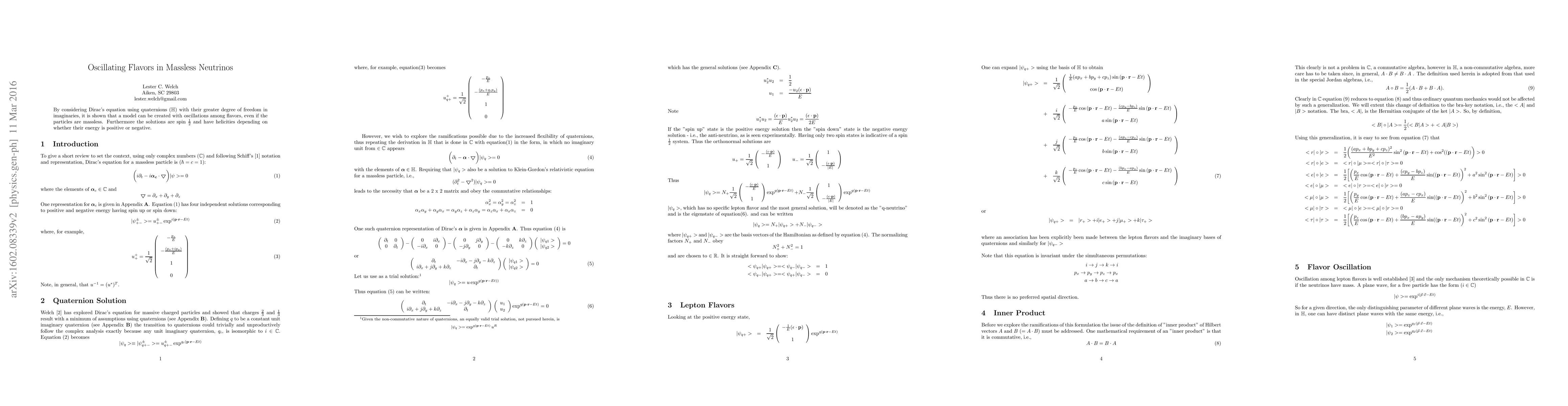 This paper demonstrates a novel model using quaternions to describe massless neutrinos, showing flavor oscillations through Dirac's equation. The solutions exhibit spin $\frac{1}{2}$ and helicities based on the energy sign, challenging conventional mass-dependent oscillation theories.