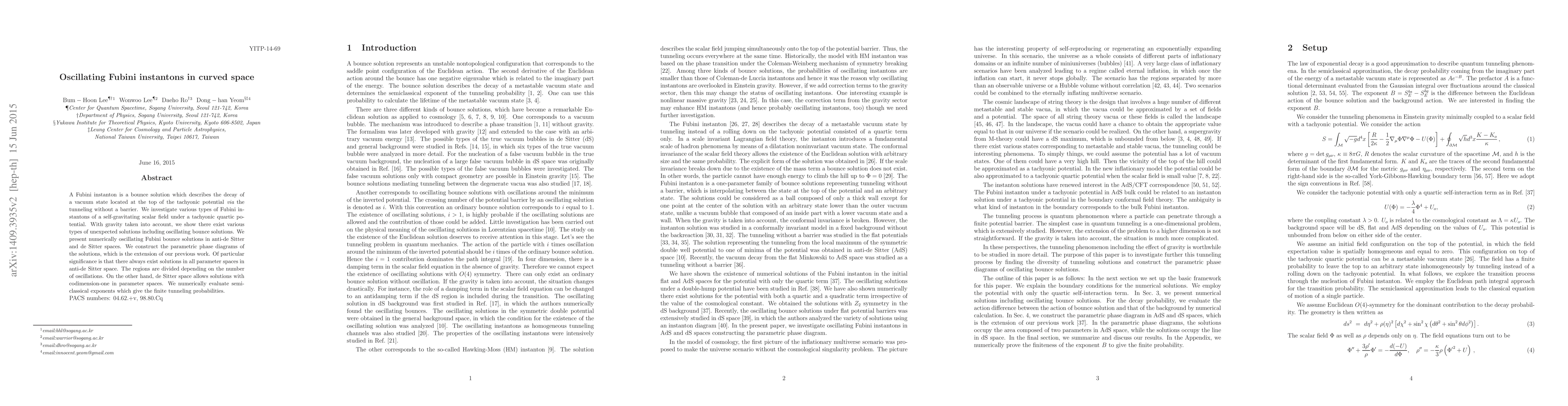 This paper investigates the existence of oscillating Fubini instantons in curved space, specifically in anti-de Sitter and de Sitter spaces, under a self-gravitating scalar field with a tachyonic quartic potential. It reveals unexpected oscillating solutions and constructs parametric phase diagrams, showing that anti-de Sitter space always allows solutions while de Sitter space permits solutions with specific parameter constraints.