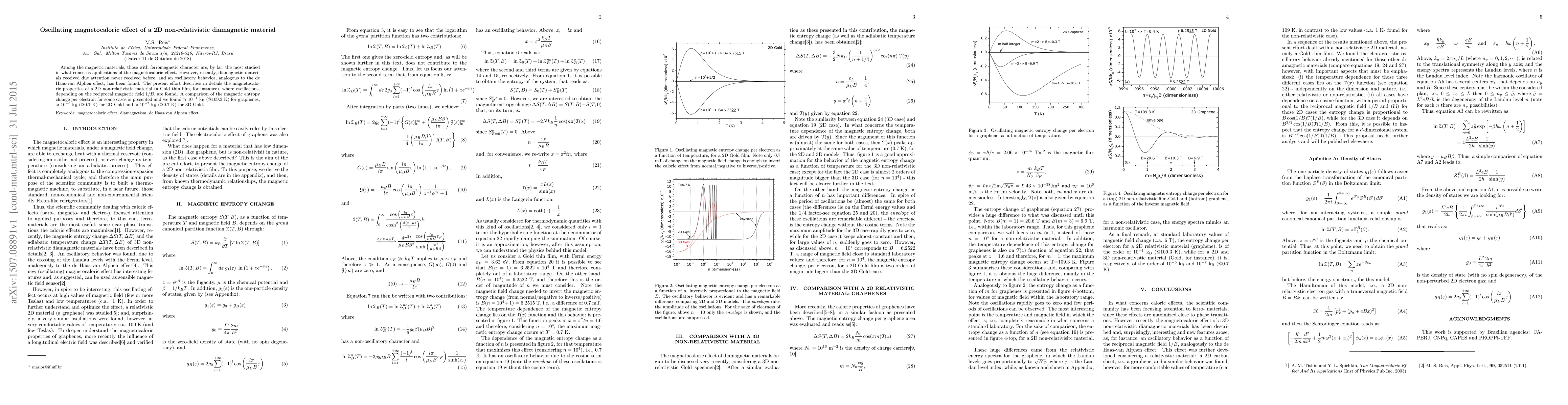 Among the magnetic materials, those with ferromagnetic character are, by far, the most studied in what concerns applications of the magnetocaloric effect. However, recently, diamagnetic materials received due attention never received before, and an oscillatory behavior, analogous to the de Haas-van Alphen effect, has been found. The present effort describes in details the magnetocaloric properties of a 2D non-relativistic material (a Gold thin film, for instance), where oscillations, depending on the reciprocal magnetic field $1/B$, are found. A comparison of the magnetic entropy change per electron for some cases is presented and we found $\approx10^{-1}$ k$_{\text{B}}$ (@109.3 K) for graphenes, $\approx10^{-5}$ k$_{\text{B}}$ (@0.7 K) for 2D Gold and $\approx 10^{-7}$ k$_{\text{B}}$ (@0.7 K) for 3D Gold.