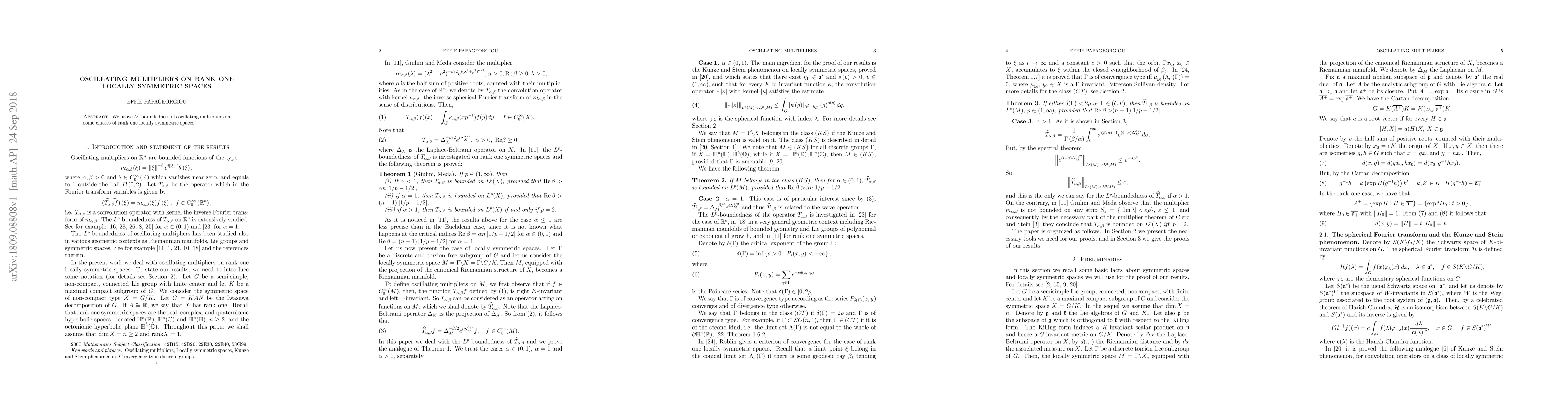 This paper establishes the $L^{p}$-boundedness of oscillating multipliers on select rank one locally symmetric spaces, contributing to the understanding of harmonic analysis in these geometric settings.