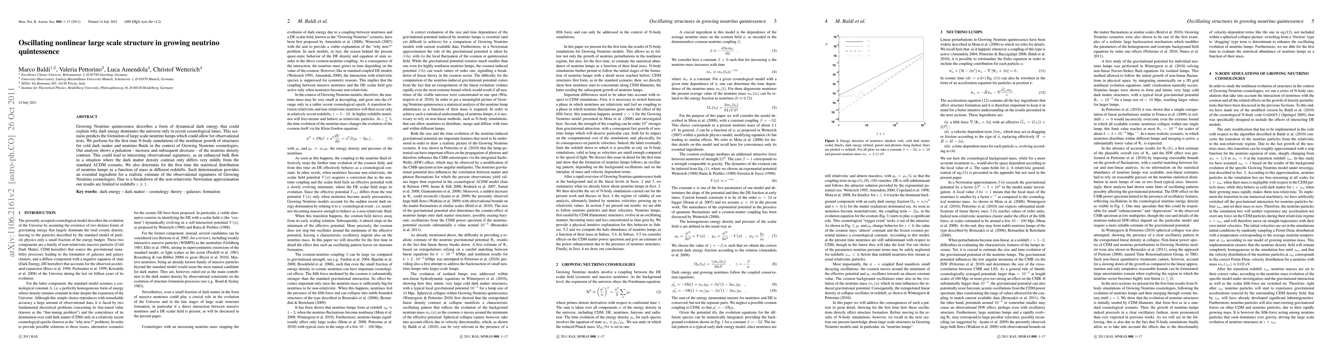 This paper investigates the nonlinear growth of structures in growing neutrino quintessence, predicting oscillating density contrasts in neutrino lumps. The study uses N-body simulations to reveal pulsations in neutrino density and provides the first statistical distribution of neutrino lumps, essential for assessing observational signatures, though limited to redshifts z > 1 due to the breakdown of the Newtonian approximation.