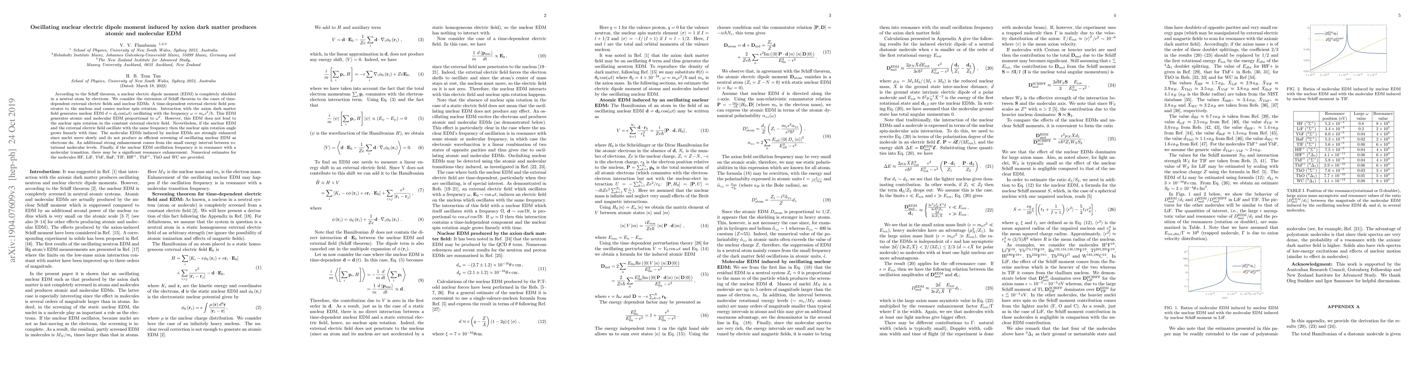 According to the Schiff theorem nuclear electric dipole moment (EDM) is completely shielded in a neutral atom by electrons. This makes a static nuclear electric dipole moment (EDM) unobservable. Interaction with the axion dark matter field generates nuclear EDM $d=d_0 \cos (\omega t)$ oscillating with the frequency $\omega= m_a c^2/\hbar$ . This EDM generates atomic EDM proportional to $\omega^2$. This effect is strongly enhanced in molecules since nuclei move slowly and do not produce as efficient screening of oscillating nuclear EDM as electrons do. An additional strong enhancement comes due to a small energy interval between rotational molecular levels. Finally, if the nuclear EDM oscillation frequency is in resonance with a molecular transition, there may be a significant resonance enhancement.