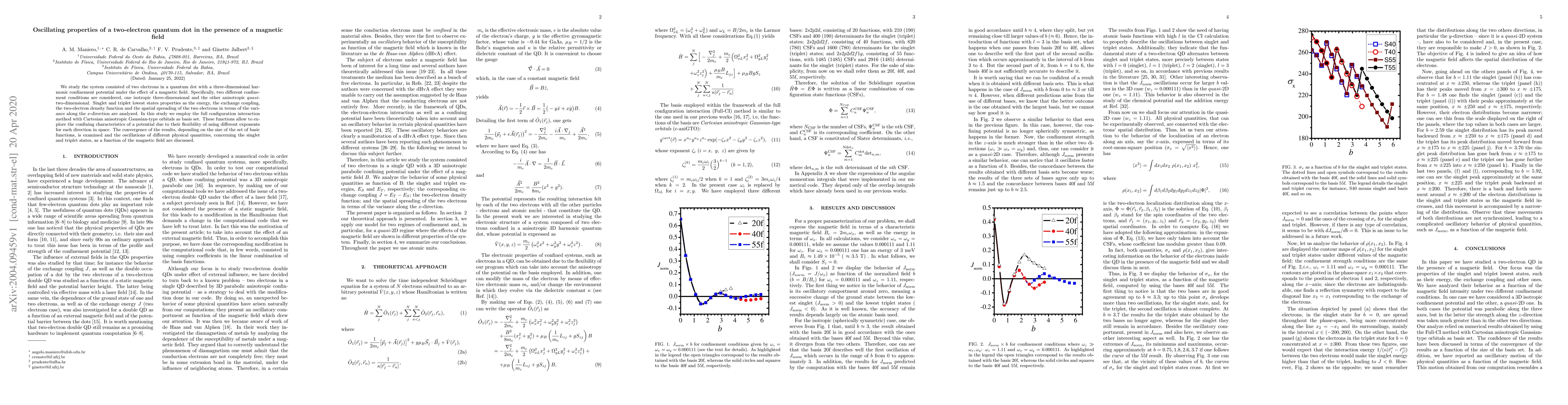 We study the system consisted of two electrons in a quantum dot with a three-dimensional harmonic confinement potential under the effect of a magnetic field. Specifically, two different confinement conditions are considered, one isotropic three-dimensional and the other anisotropic quasi-two-dimensional. Singlet and triplet lowest states properties as the energy, the exchange coupling, the two-electron density function and the spatial spreading of the two electrons in terms of the variance along the x-direction are analysed. In this study we employ the full configuration interaction method with Cartesian anisotropic Gaussian-type orbitals as basis set. These functions allow to explore the confining characteristics of a potential due to their flexibility of using different exponents for each direction in space. The convergence of the results, depending on the size of the set of basic functions, is examined and the oscillations of different physical quantities, concerning the singlet and triplet states, as a function of the magnetic field are discussed.