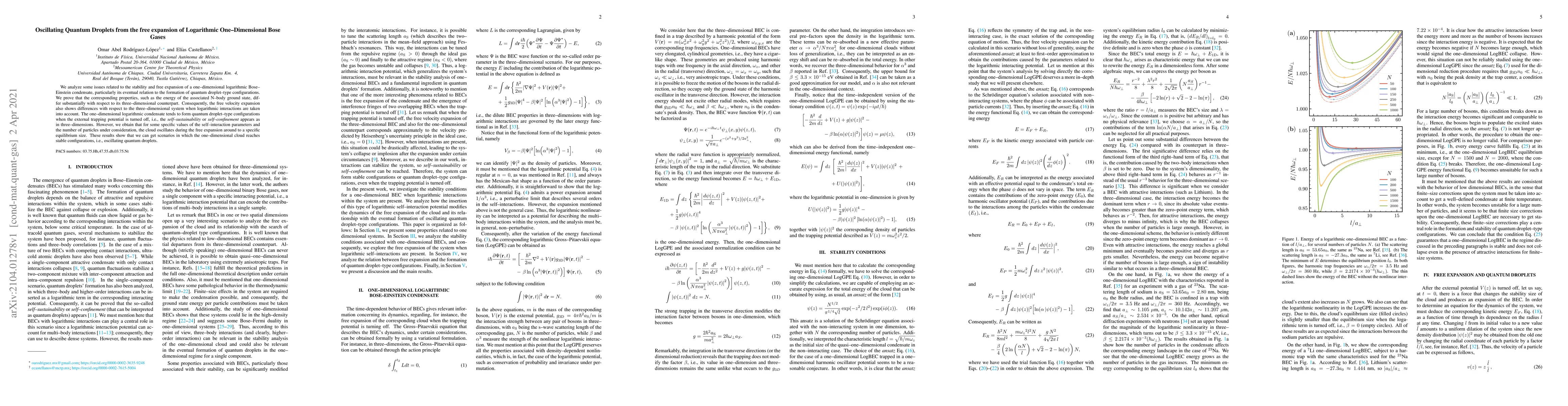 We analyze some issues related to the stability and free expansion of a one-dimensional logarithmic Bose-Einstein condensate, particularly its eventual relation to the formation of quantum droplet-type configurations. We prove that the corresponding properties, such as the energy of the associated N-body ground state, differ substantially with respect to its three-dimensional counterpart. Consequently, the free velocity expansion also shows differences with respect to the three-dimensional system when logarithmic interactions are taken into account. The one-dimensional logarithmic condensate tends to form quantum droplet-type configurations when the external trapping potential is turned off, i.e., the self-sustainability or self-confinement appears as in three-dimensions. However, we obtain that for some specific values of the self-interaction parameters and the number of particles under consideration, the cloud oscillates during the free expansion around to a specific equilibrium size. These results show that we can get scenarios in which the one-dimensional cloud reaches stable configurations, i.e., oscillating quantum droplets.