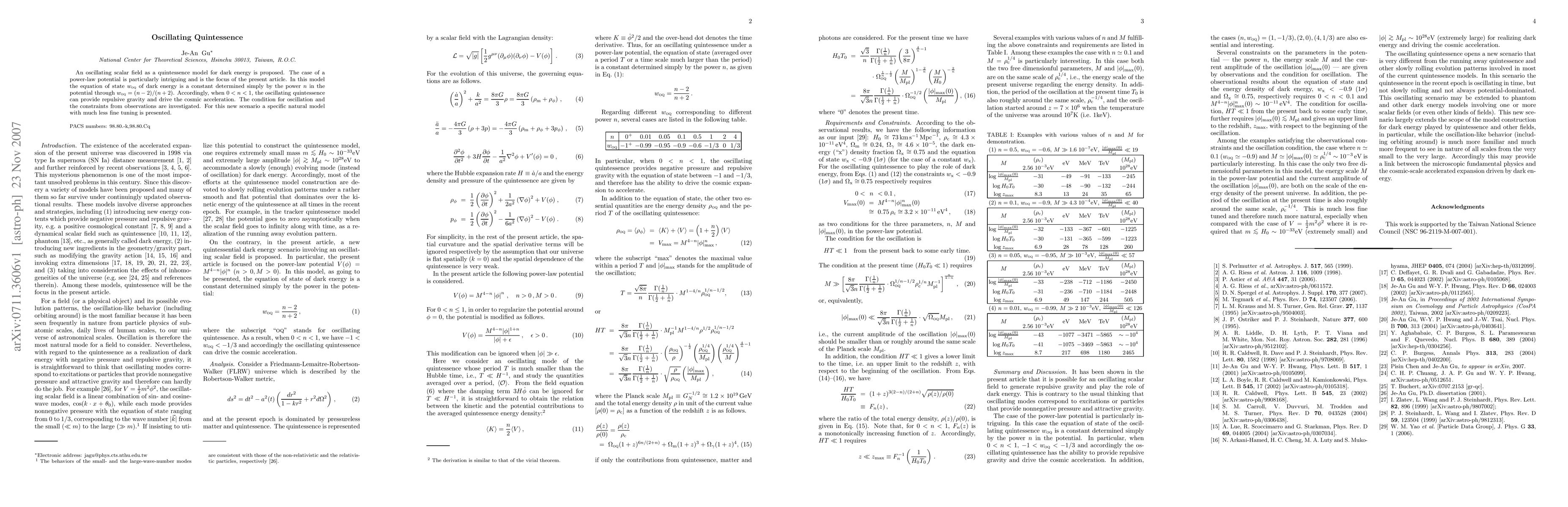 An oscillating scalar field as a quintessence model for dark energy is proposed. The case of a power-law potential is particularly intriguing and is the focus of the present article. In this model the equation of state w_{OQ} of dark energy is a constant determined simply by the power n in the potential through w_{OQ} = (n-2)/(n+2). Accordingly, when 0 < n < 1, the oscillating quintessence can provide repulsive gravity and drive the cosmic acceleration. The condition for oscillation and the constraints from observations are investigated. For this new scenario a specific natural model with much less fine tuning is presented.