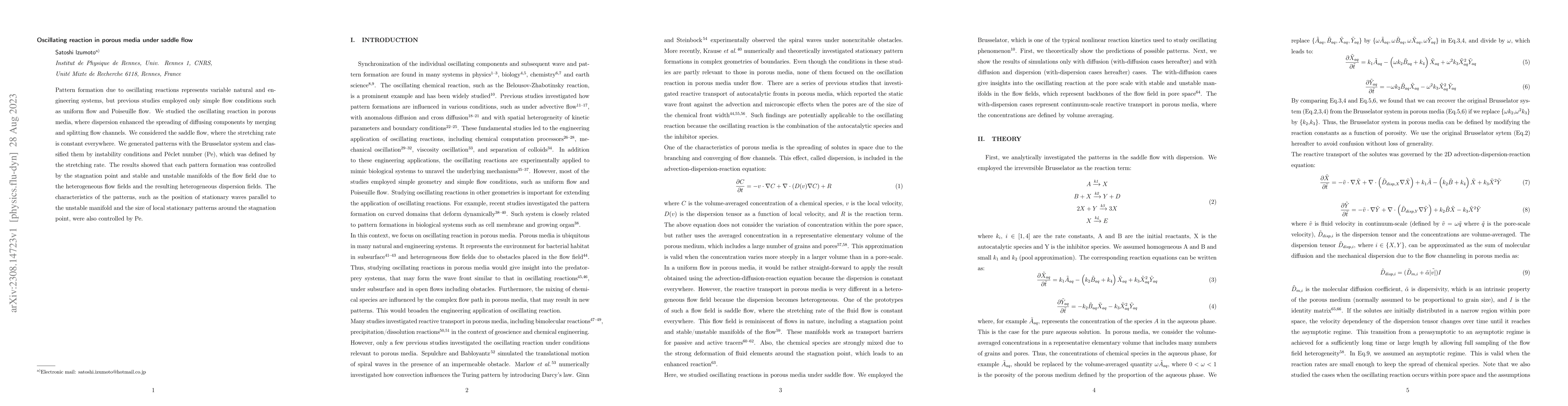 This study explores pattern formation in oscillating reactions within porous media under saddle flow, revealing that dispersion influences pattern characteristics. The Brusselator system was used to generate patterns, which were analyzed based on instability conditions and the Péclet number, showing that pattern formation is controlled by the stagnation point and flow field heterogeneities.