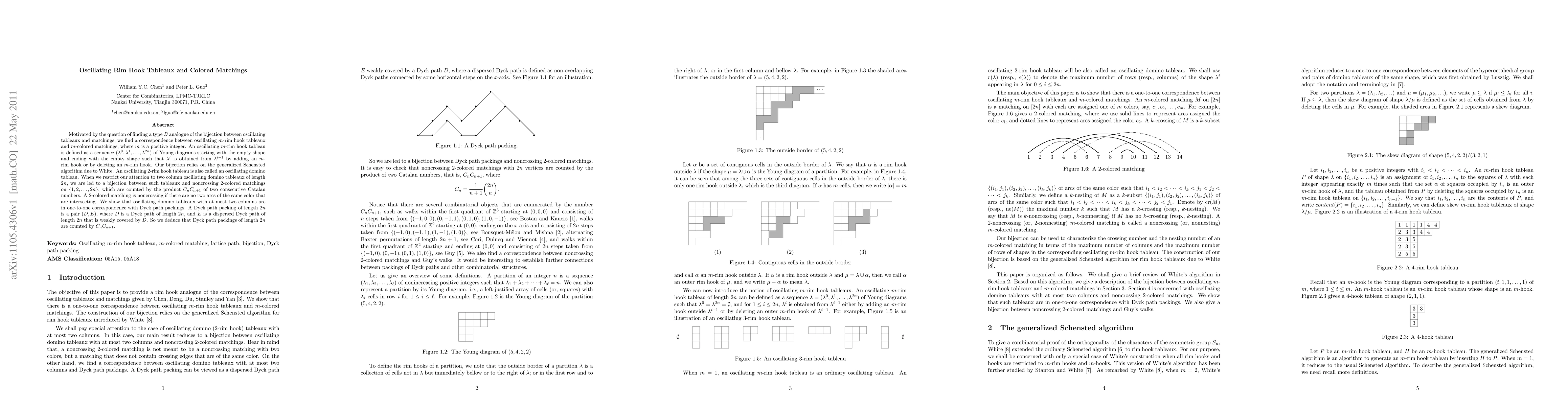 Motivated by the question of finding a type B analogue of the bijection between oscillating tableaux and matchings, we find a correspondence between oscillating m-rim hook tableaux and m-colored matchings, where m is a positive integer. An oscillating m-rim hook tableau is defined as a sequence $(\lambda^0,\lambda^1,...,\lambda^{2n})$ of Young diagrams starting with the empty shape and ending with the empty shape such that $\lambda^{i}$ is obtained from $\lambda^{i-1}$ by adding an m-rim hook or by deleting an m-rim hook. Our bijection relies on the generalized Schensted algorithm due to White. An oscillating 2-rim hook tableau is also called an oscillating domino tableau. When we restrict our attention to two column oscillating domino tableaux of length 2n, we are led to a bijection between such tableaux and noncrossing 2-colored matchings on $\{1, 2,..., 2n\}$, which are counted by the product $C_nC_{n+1}$ of two consecutive Catalan numbers. A 2-colored matching is noncrossing if there are no two arcs of the same color that are intersecting. We show that oscillating domino tableaux with at most two columns are in one-to-one correspondence with Dyck path packings. A Dyck path packing of length 2n is a pair (D, E), where D is a Dyck path of length 2n, and E is a dispersed Dyck path of length 2n that is weakly covered by D. So we deduce that Dyck path packings of length 2n are counted by $C_nC_{n+1}$.