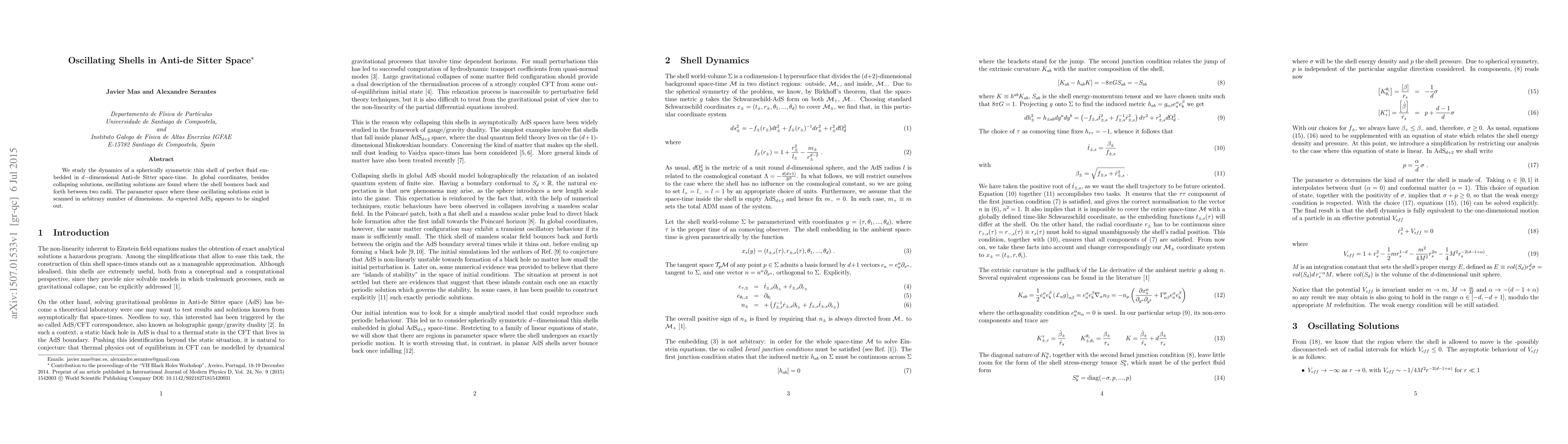 We study the dynamics of a spherically symmetric thin shell of perfect fluid embedded in d-dimensional Anti-de Sitter space-time. In global coordinates, besides collapsing solutions, oscillating solutions are found where the shell bounces back and forth between two radii. The parameter space where these oscillating solutions exist is scanned in arbitrary number of dimensions. As expected AdS3 appears to be singled out.
