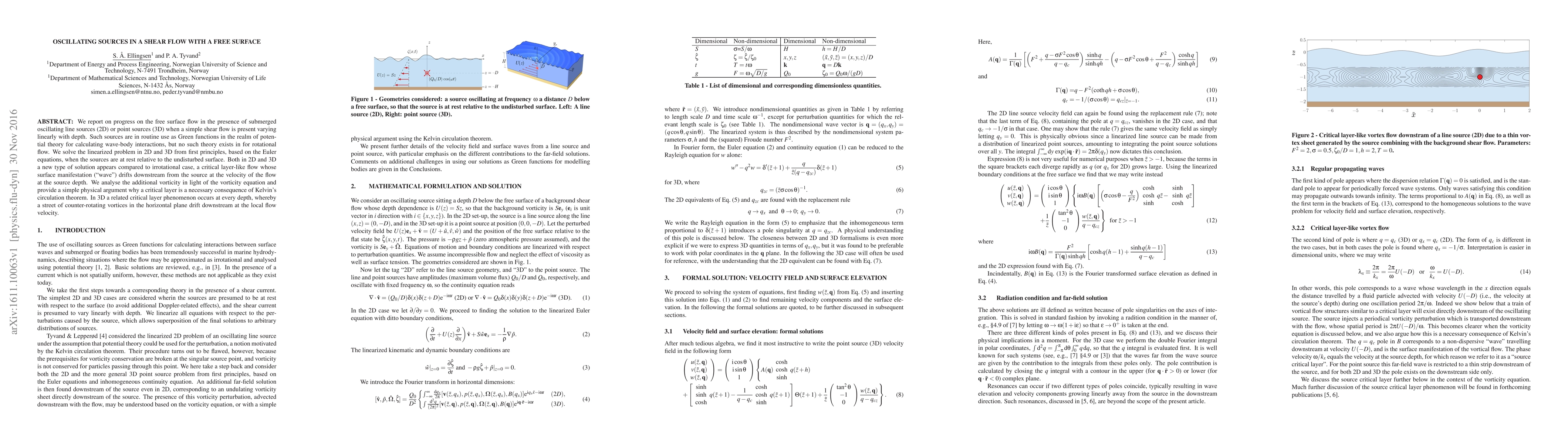 We report on progress on the free surface flow in the presence of submerged oscillating line sources (2D) or point sources (3D) when a simple shear flow is present varying linearly with depth. Such sources are in routine use as Green functions in the realm of potential theory for calculating wave-body interactions, but no such theory exists in for rotational flow. We solve the linearized problem in 2D and 3D from first principles, based on the Euler equations, when the sources are at rest relative to the undisturbed surface. Both in 2D and 3D a new type of solution appears compared to irrotational case, a critical layer-like flow whose surface manifestation ("wave") drifts downstream from the source at the velocity of the flow at the source depth. We analyse the additional vorticity in light of the vorticity equation and provide a simple physical argument why a critical layer is a necessary consequence of Kelvin's circulation theorem. In 3D a related critical layer phenomenon occurs at every depth, whereby a street of counter-rotating vortices in the horizontal plane drift downstream at the local flow velocity.