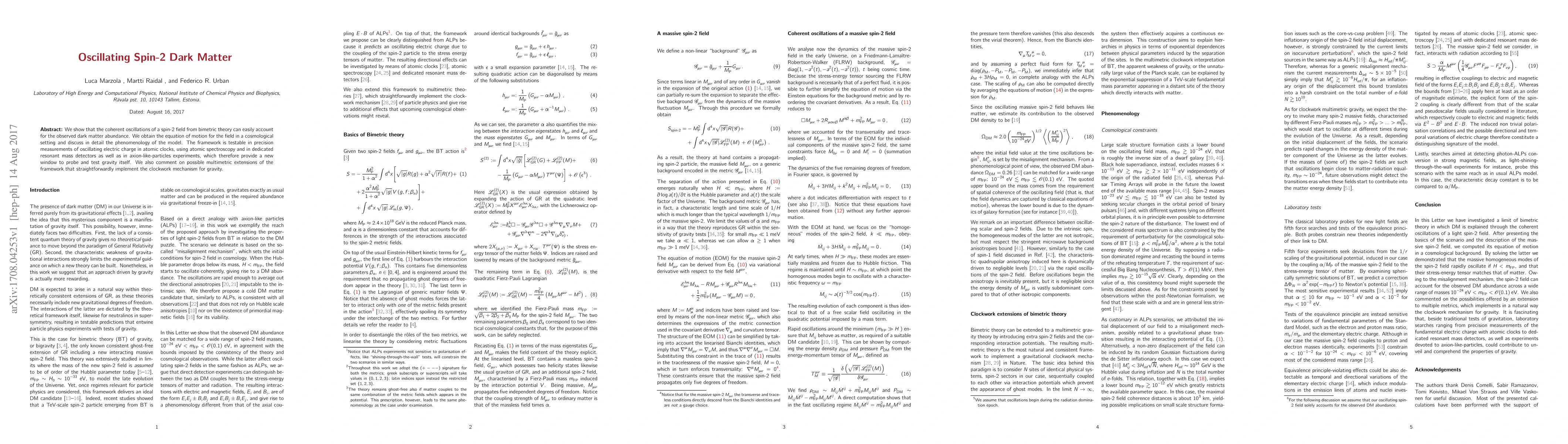 This paper proposes that coherent oscillations of a spin-2 field from bimetric theory can explain the observed dark matter abundance. It outlines the model's phenomenology and suggests that it can be tested through precision measurements in atomic clocks, spectroscopy, and resonant mass detectors, offering a new approach to probing gravity.
