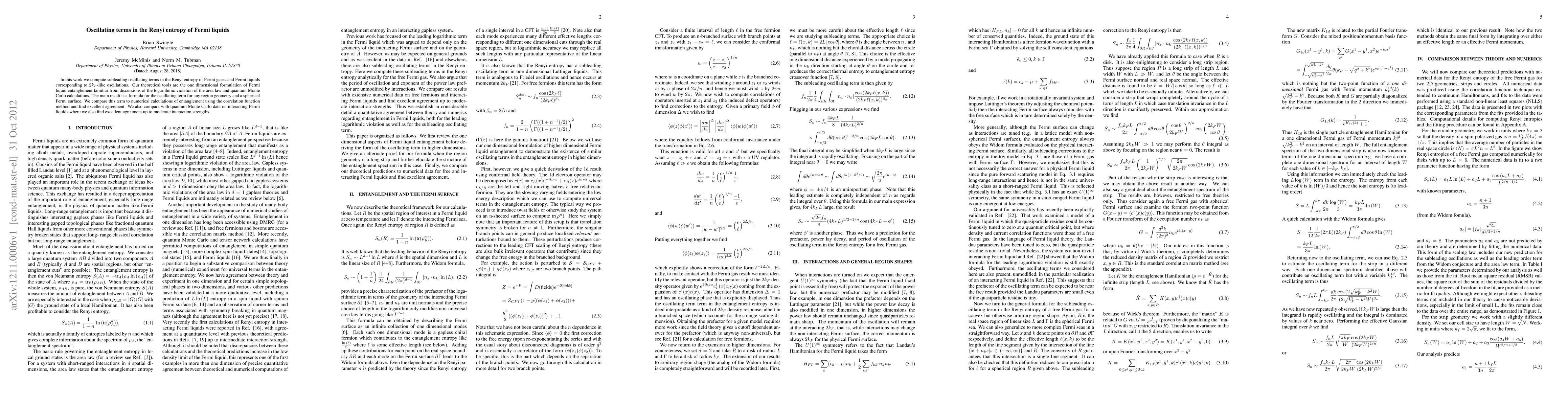 This paper computes subleading oscillating terms in the Renyi entropy of Fermi gases and liquids, revealing $2k_F$-like oscillations. The study provides a formula for these terms for any region geometry and spherical Fermi surfaces, showing excellent agreement with numerical calculations and quantum Monte Carlo data.