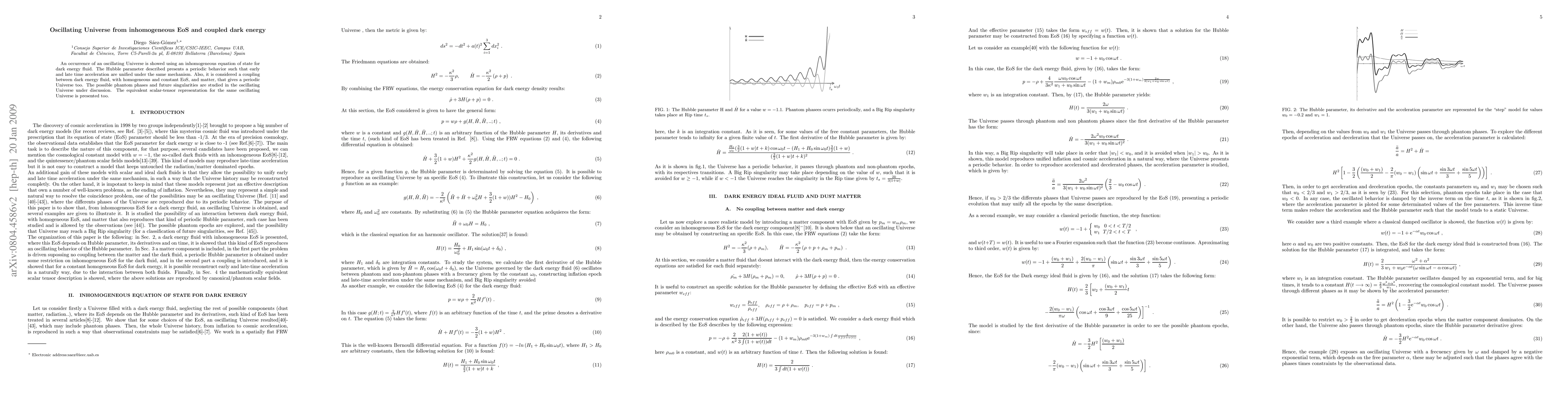 This paper explores an oscillating universe driven by an inhomogeneous equation of state for dark energy fluid, showing periodic Hubble parameter behavior that unifies early and late-time accelerations. It also investigates the coupling between dark energy and matter, leading to periodic universe oscillations, phantom phases, and future singularities, alongside a scalar-tensor representation.