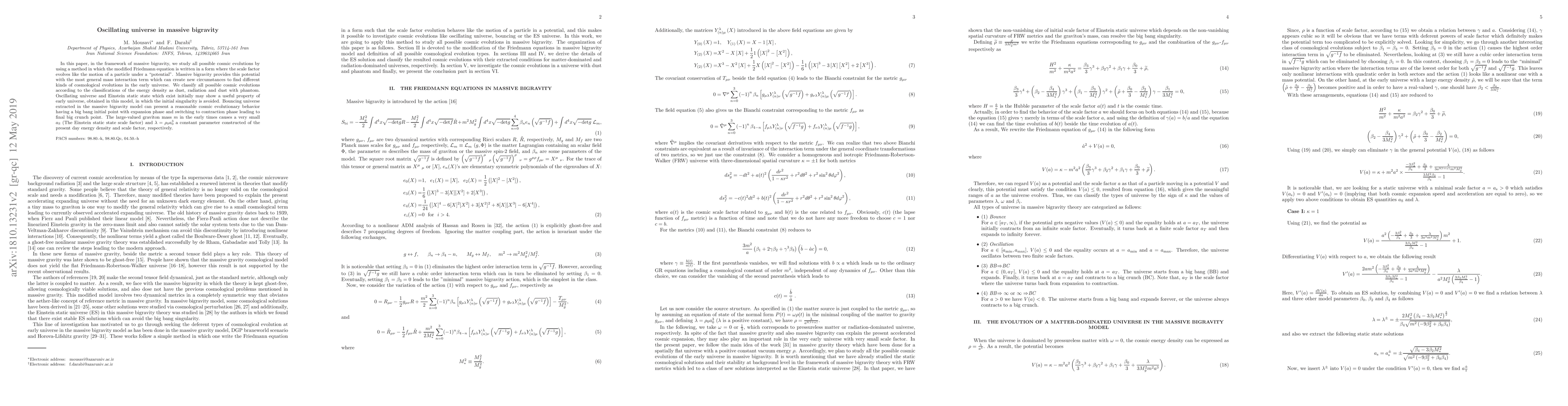 This paper investigates cosmic evolutions in the context of massive bigravity by modeling the scale factor evolution under a modified Friedmann equation. It finds diverse early universe scenarios, including oscillating universes, bouncing universes, and Einstein static states that avoid initial singularities.