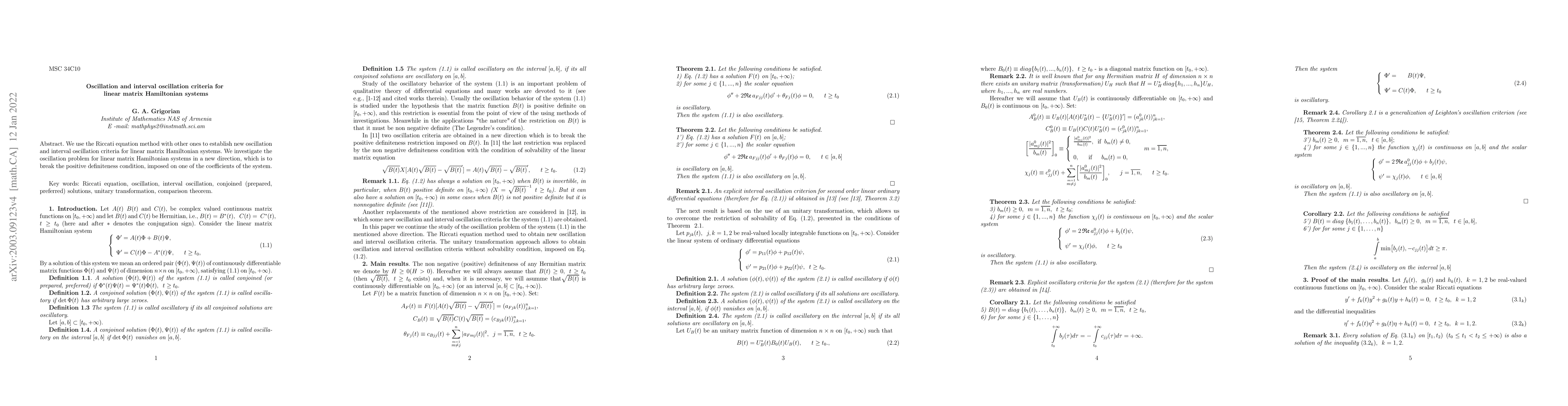 Summary: This paper introduces new oscillation and interval oscillation criteria for linear matrix Hamiltonian systems using the Riccati equation method, breaking the traditional positive definiteness condition on one coefficient. The research advances the understanding of these systems beyond conventional assumptions.