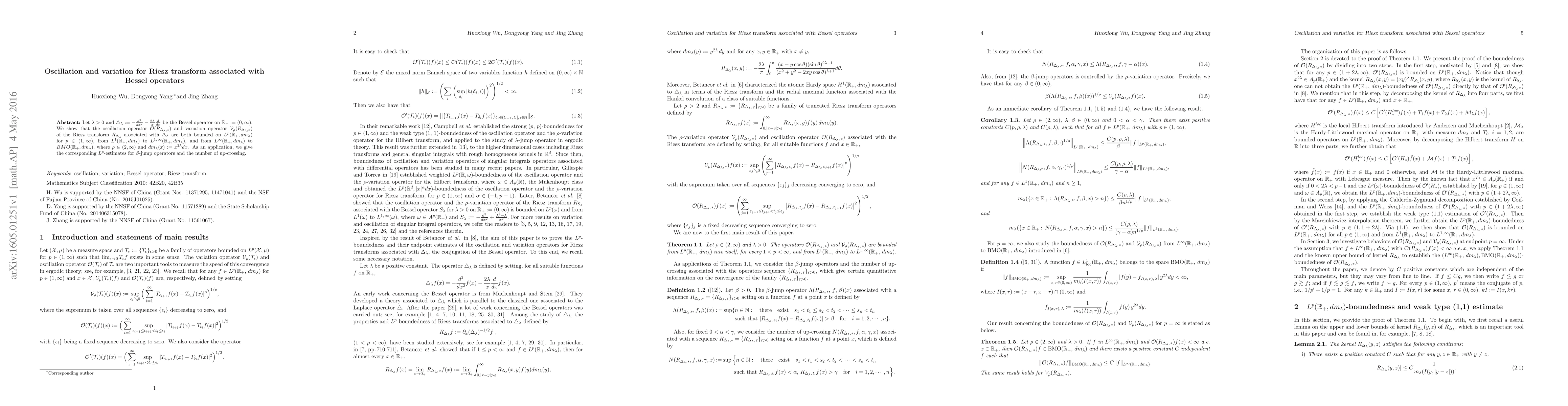 Let $\lambda>0$ and $\triangle_\lambda:=-\frac{d^2}{dx^2}-\frac{2\lambda}{x} \frac d{dx}$ be the Bessel operator on $\mathbb R_+:=(0,\infty)$. We show that the oscillation operator $\mathcal{O}(R_{\Delta_{\lambda},\ast})$ and variation operator $\mathcal{V}_{\rho}(R_{\Delta_{\lambda},\ast})$ of the Riesz transform $R_{\Delta_{\lambda}}$ associated with $\Delta_\lambda$ are both bounded on $L^p(\mathbb R_+, dm_{\lambda})$ for $p\in(1,\,\infty)$, from $L^1(\mathbb{R}_{+},dm_{\lambda})$ to $L^{1,\,\infty}(\mathbb{R}_{+},dm_{\lambda})$, and from $L^{\infty}(\mathbb{R}_{+},dm_{\lambda})$ to $BMO(\mathbb{R}_{+},dm_{\lambda})$, where $\rho\in (2,\infty)$ and $dm_{\lambda}(x):=x^{2\lambda}dx$. As an application, we give the corresponding $L^p$-estimates for $\beta$-jump operators and the number of up-crossing.