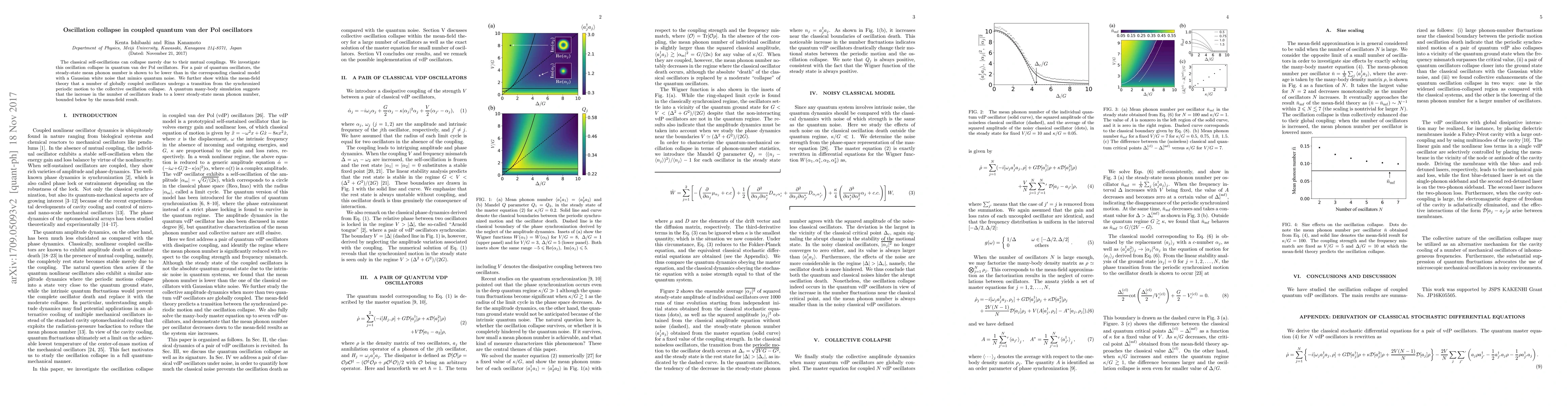 This paper investigates the phenomenon of oscillation collapse in coupled quantum van der Pol oscillators, demonstrating that the steady-state mean phonon number is lower than in the classical counterpart due to quantum noise. It shows a transition from synchronized periodic motion to collective oscillation collapse in globally coupled oscillators, supported by quantum many-body simulation results.