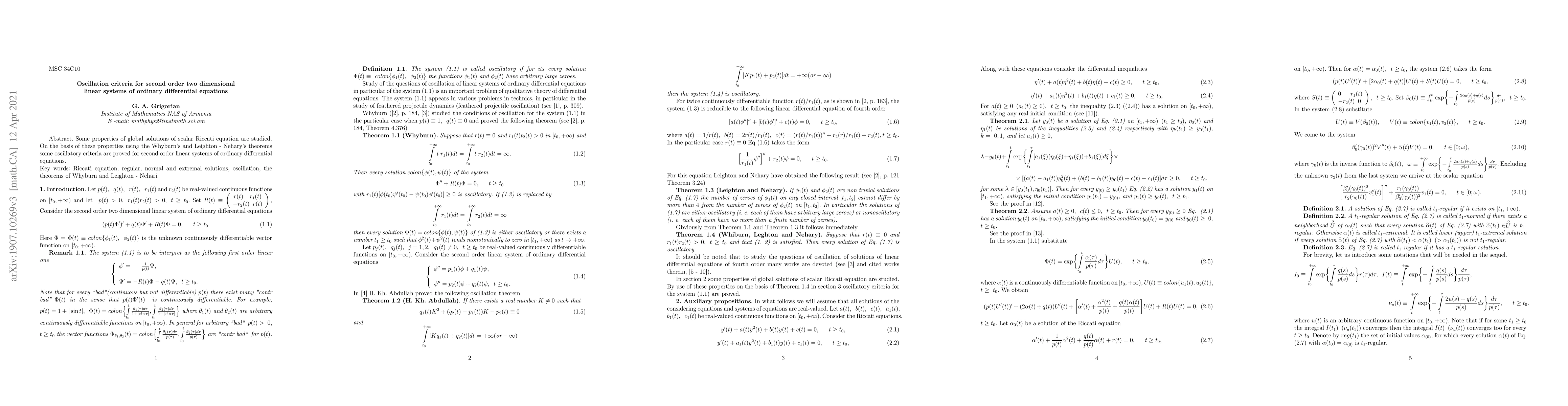 This paper explores global solution properties of the scalar Riccati equation and utilizes Whiburn's and Leighton-Nehary's theorems to establish oscillation criteria for second-order, two-dimensional linear systems of ordinary differential equations. The findings provide new insights into the oscillatory behavior of these systems.