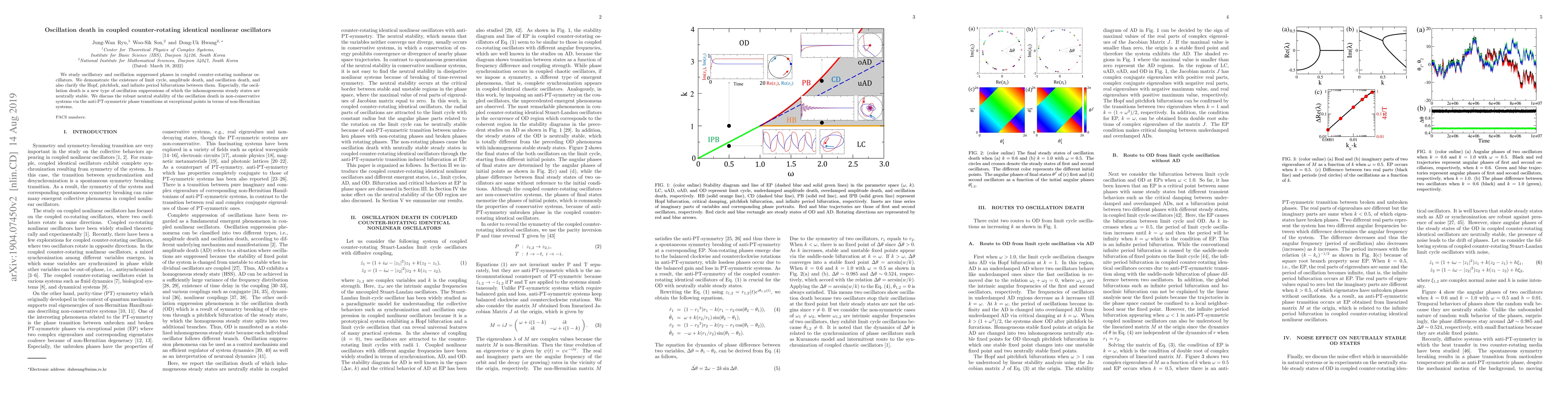 This paper investigates coupled counter-rotating nonlinear oscillators, demonstrating phenomena such as limit cycle, amplitude death, and a novel oscillation death state, alongside various bifurcations. The study highlights the robust neutral stability of oscillation death through anti-PT-symmetric phase transitions in non-Hermitian systems.