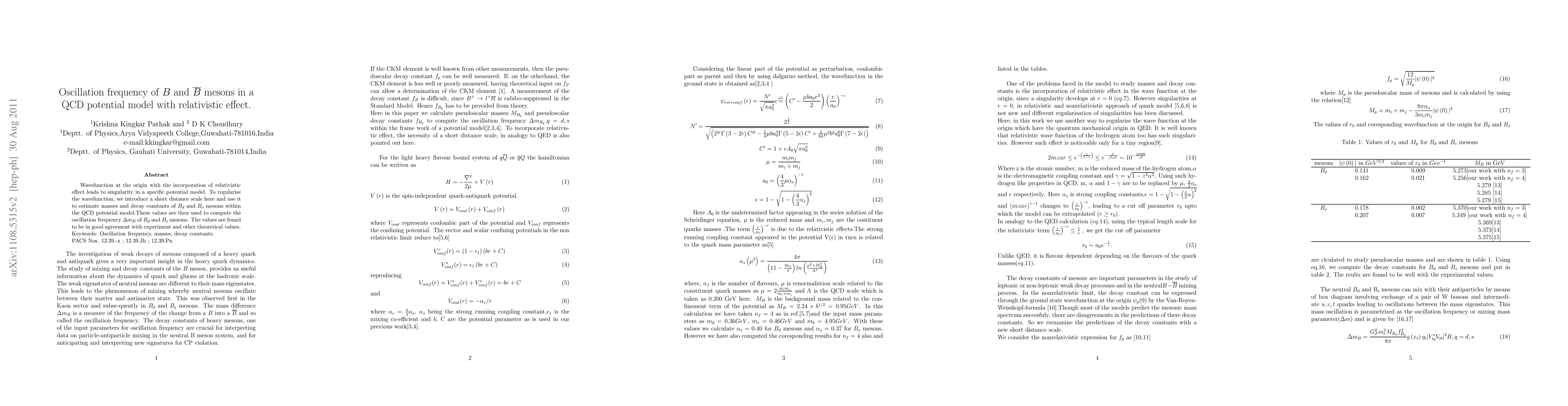 This paper investigates the oscillation frequency of B and B mesons using a QCD potential model with relativistic effects, regularizing the wavefunction singularity by introducing a short distance scale. The computed values for Bd and Bs meson masses and decay constants align well with experimental and theoretical data.