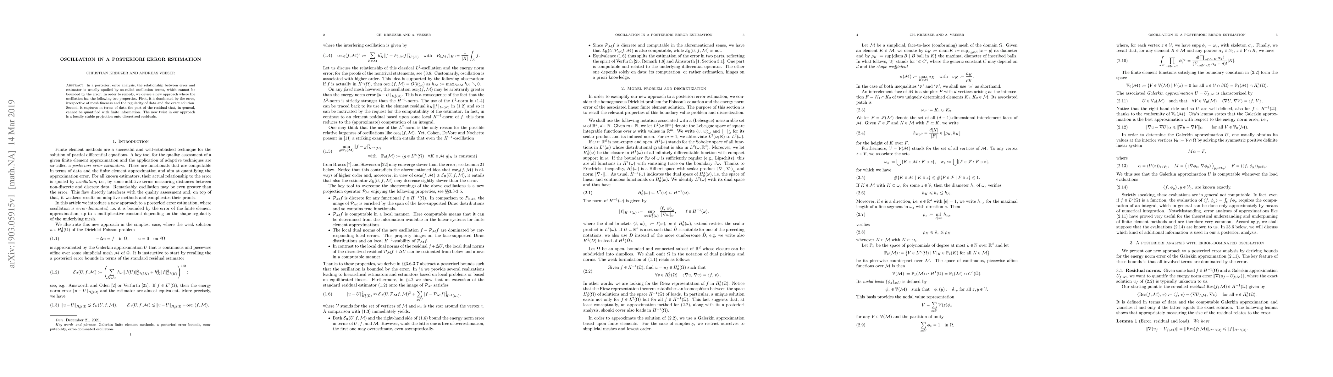 In a posteriori error analysis, the relationship between error and estimator is usually spoiled by so-called oscillation terms, which cannot be bounded by the error. In order to remedy, we devise a new approach where the oscillation has the following two properties. First, it is dominated by the error, irrespective of mesh fineness and the regularity of data and the exact solution. Second, it captures in terms of data the part of the residual that, in general, cannot be quantified with finite information. The new twist in our approach is a locally stable projection onto discretized residuals.