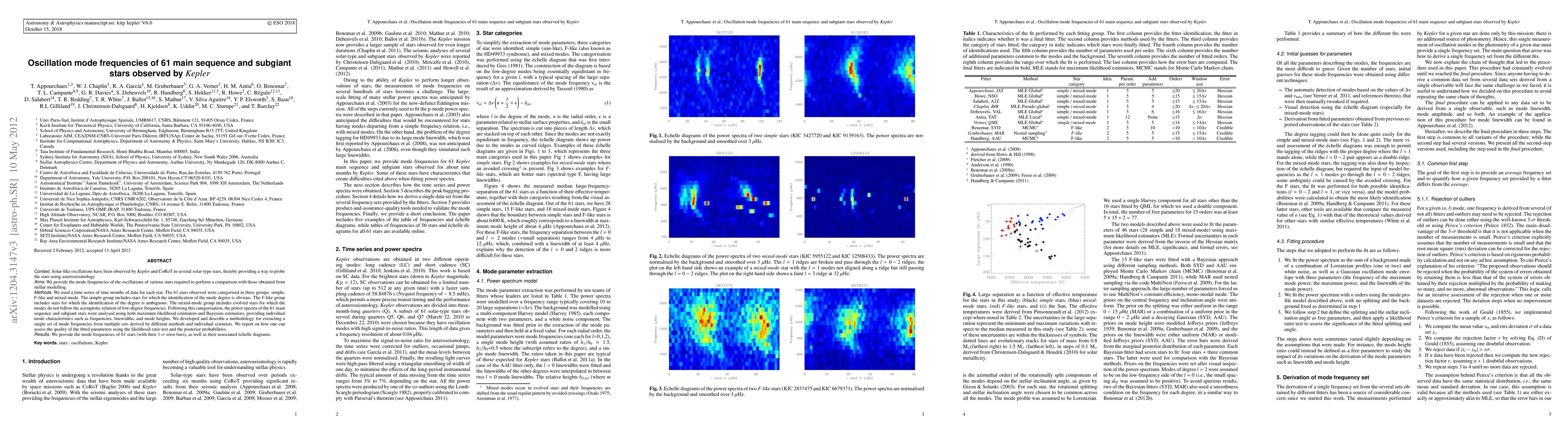 This paper reports the oscillation mode frequencies of 61 main sequence and subgiant stars observed by Kepler, categorized into simple, F-like, and mixed-mode groups. The study uses nine months of data to analyze power spectra and extract mode frequencies, linewidths, and mode heights using maximum likelihood and Bayesian estimators.