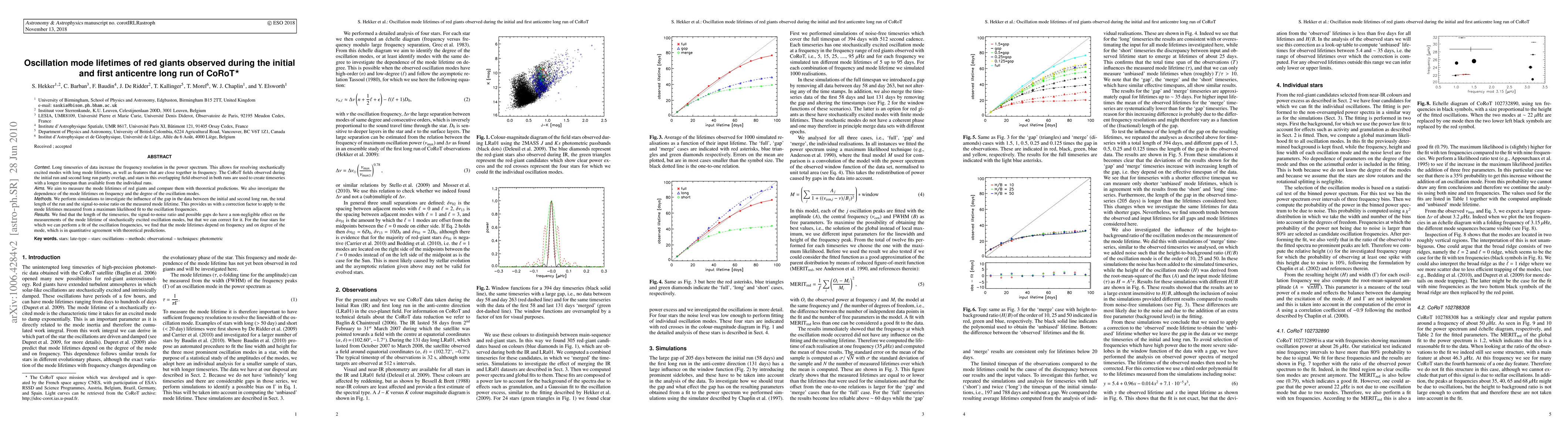 Long timeseries of data increase the frequency resolution in the power spectrum. This allows for resolving stochastically excited modes with long mode lifetimes, as well as features that are close together in frequency. The CoRoT fields observed during the initial run and second long run partly overlap, and stars in this overlapping field observed in both runs are used to create timeseries with a longer timespan than available from the individual runs. We aim to measure the mode lifetimes of red giants and compare them with theoretical predictions. We also investigate the dependence of the mode lifetimes on frequency and the degree of the oscillation modes. We perform simulations to investigate the influence of the gap in the data between the initial and second long run, the total length of the run and the signal-to-noise ratio on the measured mode lifetime. This provides us with a correction factor to apply to the mode lifetimes measured from a maximum likelihood fit to the oscillation frequencies. We find that the length of the timeseries, the signal-to-noise ratio and possible gaps do have a non-negligible effect on the measurements of the mode lifetime of stochastically excited oscillation modes, but that we can correct for it. For the four stars for which we can perform a fit of the oscillation frequencies, we find that the mode lifetimes depend on frequency and on degree of the mode, which is in quantitative agreement with theoretical predictions.