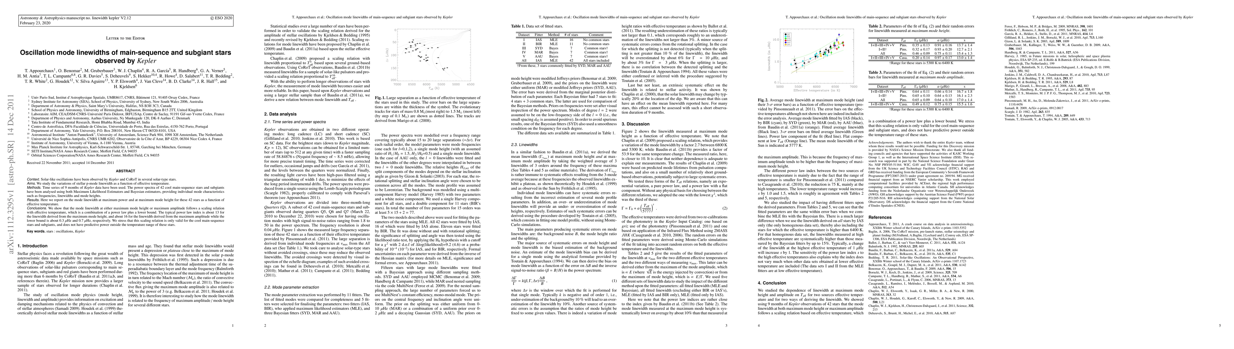 Solar-like oscillations have been observed by {{\it Kepler}} and CoRoT in several solar-type stars. We study the variations of stellar p-mode linewidth as a function of effective temperature. Time series of 9 months of Kepler data have been used. The power spectra of 42 cool main-sequence stars and subgiants have been analysed using both Maximum Likelihood Estimators and Bayesian estimators, providing individual mode characteristics such as frequencies, linewidths and mode heights. Here we report on the mode linewidth at maximum power and at maximum mode height for these 42 stars as a function of effective temperature. We show that the mode linewidth at either maximum mode height or maximum amplitude follows a scaling relation with effective temperature, which is a combination of a power law plus a lower bound. The typical power law index is about 13 for the linewidth derived from the maximum mode height, and about 16 for the linewidth derived from the maximum amplitude while the lower bound is about 0.3 microHz and 0.7 microHz, respectively. We stress that this scaling relation is only valid for the cool main-sequence stars and subgiants, and does not have predictive power outside the temperature range of these stars.