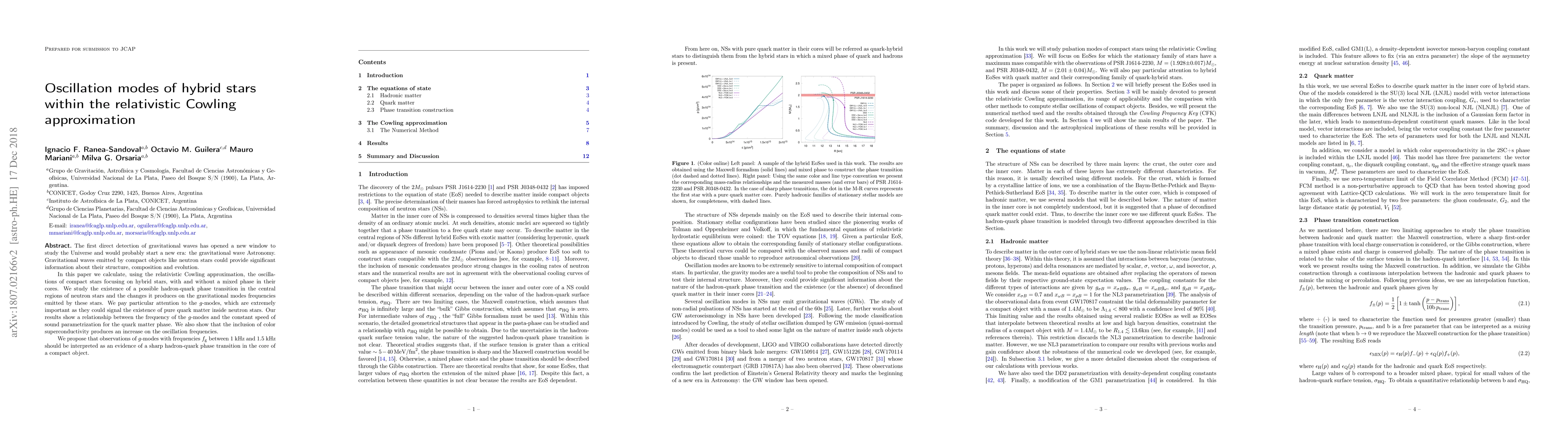 The first direct detection of gravitational waves has opened a new window to study the Universe and would probably start a new era: the gravitational wave Astronomy. Gravitational waves emitted by compact objects like neutron stars could provide significant information about their structure, composition and evolution. In this paper we calculate, using the relativistic Cowling approximation, the oscillations of compact stars focusing on hybrid stars, with and without a mixed phase in their cores. We study the existence of a possible hadron-quark phase transition in the central regions of neutron stars and the changes it produces on the gravitational modes frequencies emitted by these stars. We pay particular attention to the $g$-modes, which are extremely important as they could signal the existence of pure quark matter inside neutron stars. Our results show a relationship between the frequency of the $g$-modes and the constant speed of sound parametrization for the quark matter phase. We also show that the inclusion of color superconductivity produces an increase on the oscillation frequencies. We propose that observations of $g$-modes with frequencies $f_{\rm g}$ between $1$ kHz and $1.5$ kHz should be interpreted as an evidence of a sharp hadron-quark phase transition in the core of a compact object.