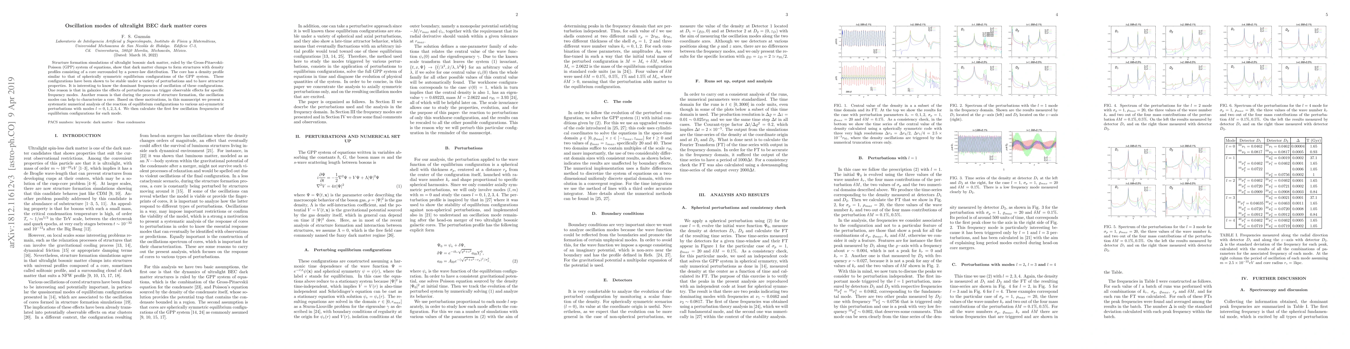 Structure formation simulations of ultralight bosonic dark matter, ruled by the Gross-Pitaevskii-Poisson (GPP) system of equations, show that dark matter clumps to form structures with density profiles consisting of a core surrounded by a power-law distribution. The core has a density profile similar to that of spherically symmetric equilibrium configurations of the GPP system. These configurations have been shown to be stable under a variety of perturbations and to have attractor properties. It is interesting to know the dominant frequencies of oscillation of these configurations. One reason is that in galaxies the effects of perturbations can trigger observable effects for specific frequency modes. Another reason is that during the process of structure formation, the oscillation modes can help to characterize a core. Based on these motivations, in this manuscript we present a systematic numerical analysis of the reaction of equilibrium configurations to various axi-symmetric perturbations with modes $l=0,1,2,3,4$. We then calculate the first few oscillation frequencies of equilibrium configurations for each mode.