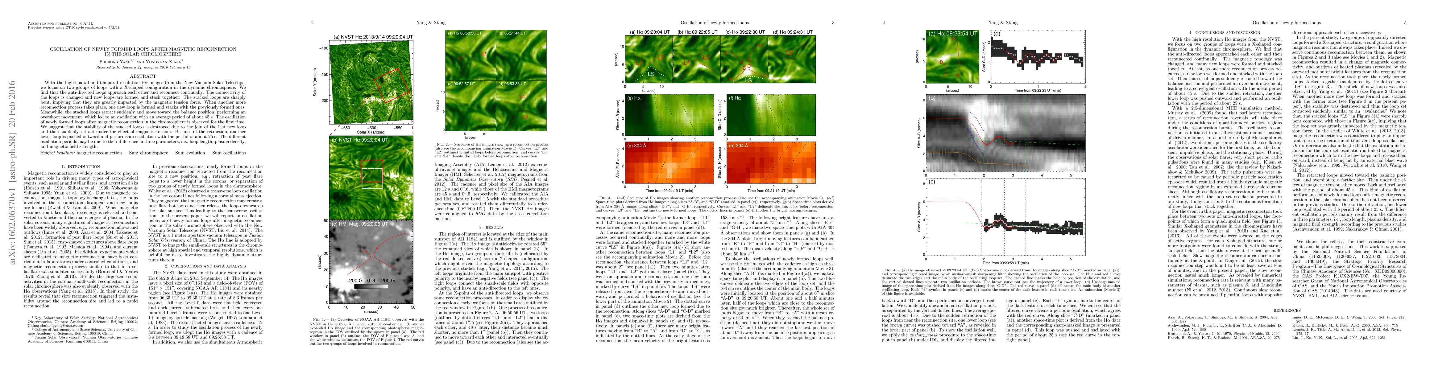 With the high spatial and temporal resolution H$\alpha$ images from the New Vacuum Solar Telescope, we focus on two groups of loops with a X-shaped configuration in the dynamic chromosphere. We find that the anti-directed loops approach each other and reconnect continually. The connectivity of the loops is changed and new loops are formed and stack together. The stacked loops are sharply bent, implying that they are greatly impacted by the magnetic tension force. When another more reconnection process takes place, one new loop is formed and stacks with the previously formed ones. Meanwhile, the stacked loops retract suddenly and move toward the balance position, performing an overshoot movement, which led to an oscillation with an average period of about 45 s. The oscillation of newly formed loops after magnetic reconnection in the chromosphere is observed for the first time. We suggest that the stability of the stacked loops is destroyed due to the join of the last new loop and then suddenly retract under the effect of magnetic tension. Because of the retraction, another lower loop is pushed outward and performs an oscillation with the period of about 25 s. The different oscillation periods may be due to their difference in three parameters, i.e., loop length, plasma density, and magnetic field strength.