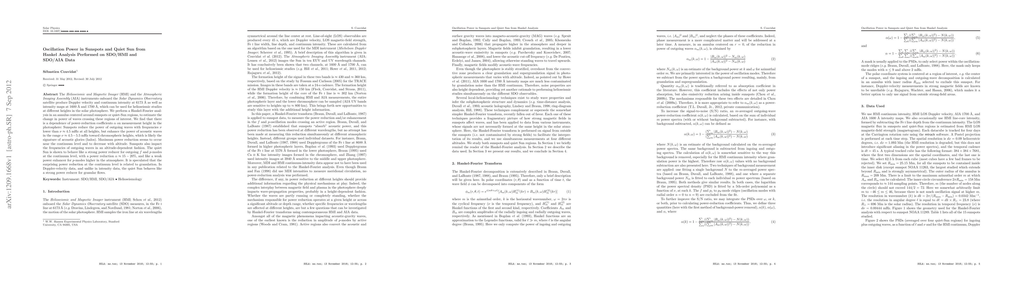 The Helioseismic and Magnetic Imager (HMI) and the Atmospheric Imaging Assembly (AIA) instruments onboard the Solar Dynamics Observatory satellite produce Doppler velocity and continuum intensity at 6173 A as well as intensity maps at 1600 A and 1700 A, which can be used for helioseismic studies at different heights in the solar photosphere. We perform a Hankel-Fourier analysis in an annulus centered around sunspots or quiet-Sun regions, to estimate the change in power of waves crossing these regions of interest. We find that there is a dependence of power-reduction coefficients on measurement height in the photosphere: Sunspots reduce the power of outgoing waves with frequencies lower than 4.5 mHz at all heights, but enhance the power of acoustic waves in the range 4.5-5.5 mHz toward chromospheric heights, which is likely the signature of acoustic glories (halos). Maximum power reduction seems to occur near the continuum level and to decrease with altitude. Sunspots also impact the frequencies of outgoing waves in an altitude-dependent fashion. The quiet Sun is shown to behave like a strong power reducer for outgoing f and p-modes at the continuum level, with a power reduction 15-20%, and like a weak power enhancer for p-modes higher in the atmosphere. It is speculated that the surprising power reduction at the continuum level is related to granulation. In Doppler-velocity data, and unlike in intensity data, the quiet Sun behaves like a strong power reducer for granular flows.