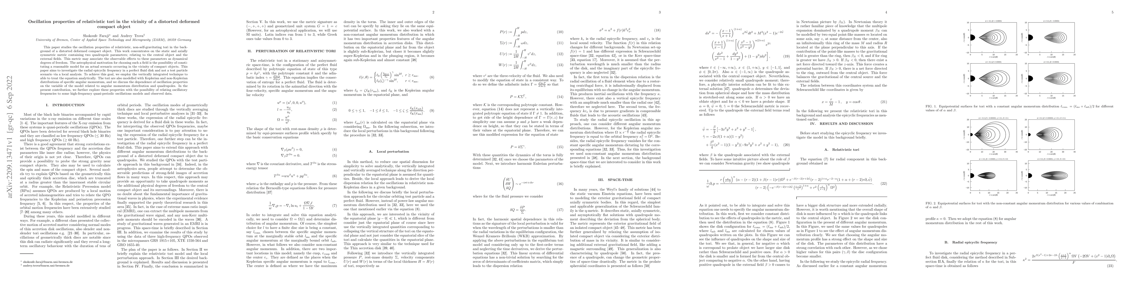 This paper investigates the oscillation properties of relativistic tori around a distorted compact object, focusing on the radial epicyclic frequency in a perfect fluid disk. It employs a vertically integrated technique to analyze the effects of quadrupole parameters and angular momentum distributions on these oscillations.