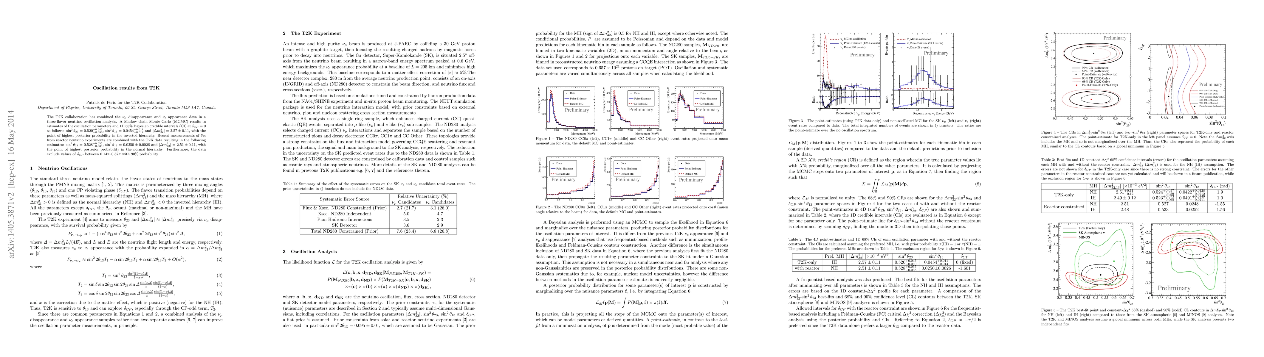 The T2K collaboration reports new oscillation parameters for neutrino flavors, with estimates of sin^2 theta_23, sin^2 theta_13, and Delta m^2_32 indicating a normal hierarchy. The data also excludes values of CP phase delta_CP between 0.14*pi-0.87*pi.