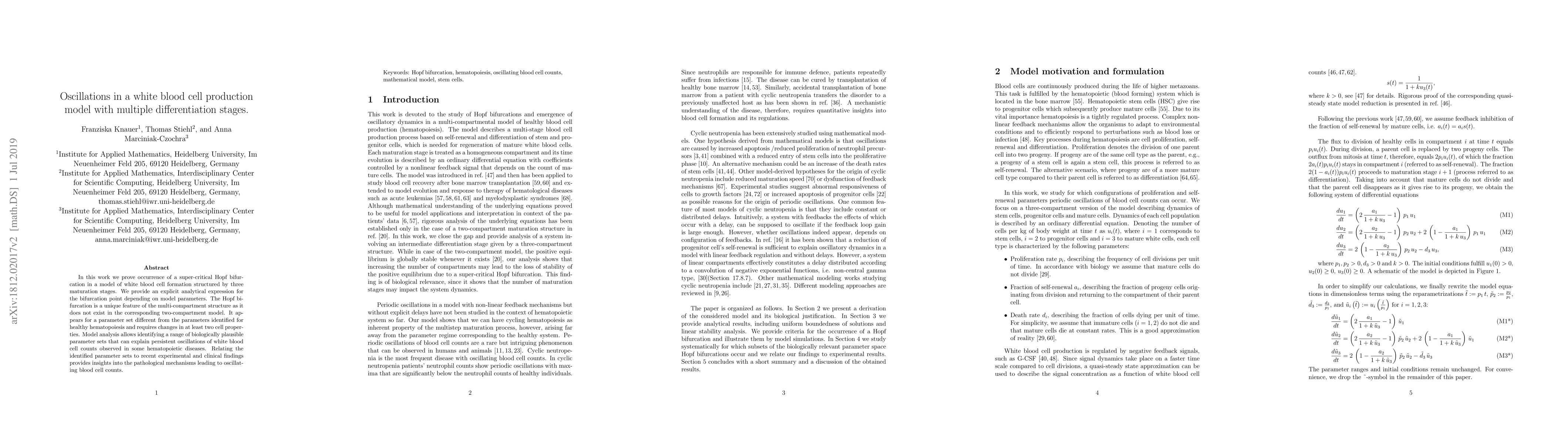 In this work we prove occurrence of a super-critical Hopf bifurcation in a model of white blood cell formation structured by three maturation stages. We provide an explicit analytical expression for the bifurcation point depending on model parameters. The Hopf bifurcation is a unique feature of the multi-compartment structure as it does not exist in the corresponding two-compartment model. It appears for a parameter set different from the parameters identified for healthy hematopoiesis and requires changes in at least two cell properties. Model analysis allows identifying a range of biologically plausible parameter sets that can explain persistent oscillations of white blood cell counts observed in some hematopoietic diseases. Relating the identified parameter sets to recent experimental and clinical findings provides insights into the pathological mechanisms leading to oscillating blood cell counts.