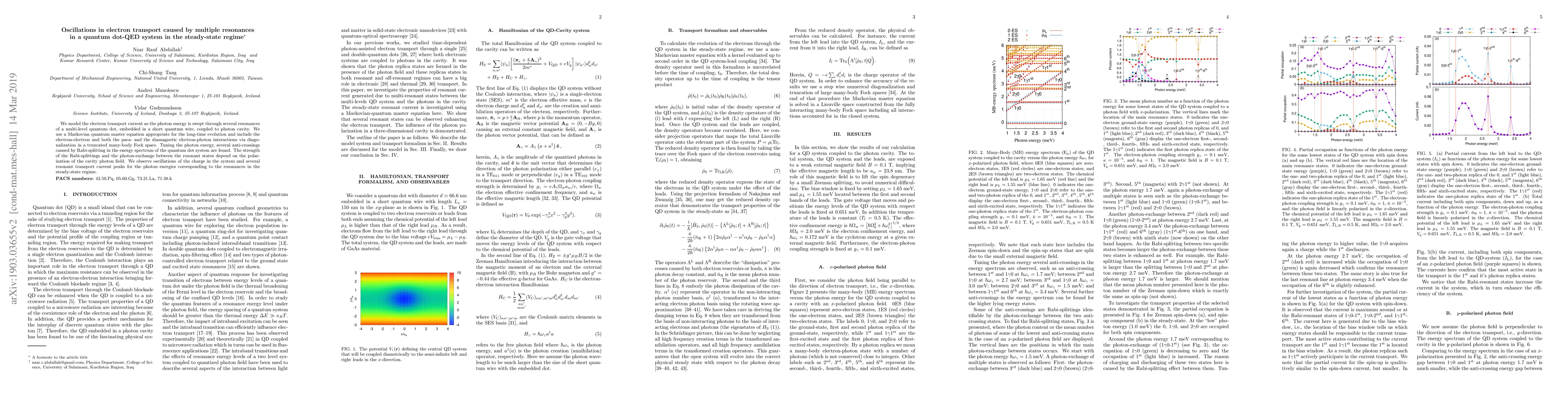 This paper models electron transport in a quantum dot-QED system, revealing oscillations in current due to multiple resonances and Rabi-splittings influenced by cavity photon polarization, leading to distinct transport current peaks in the steady-state regime.