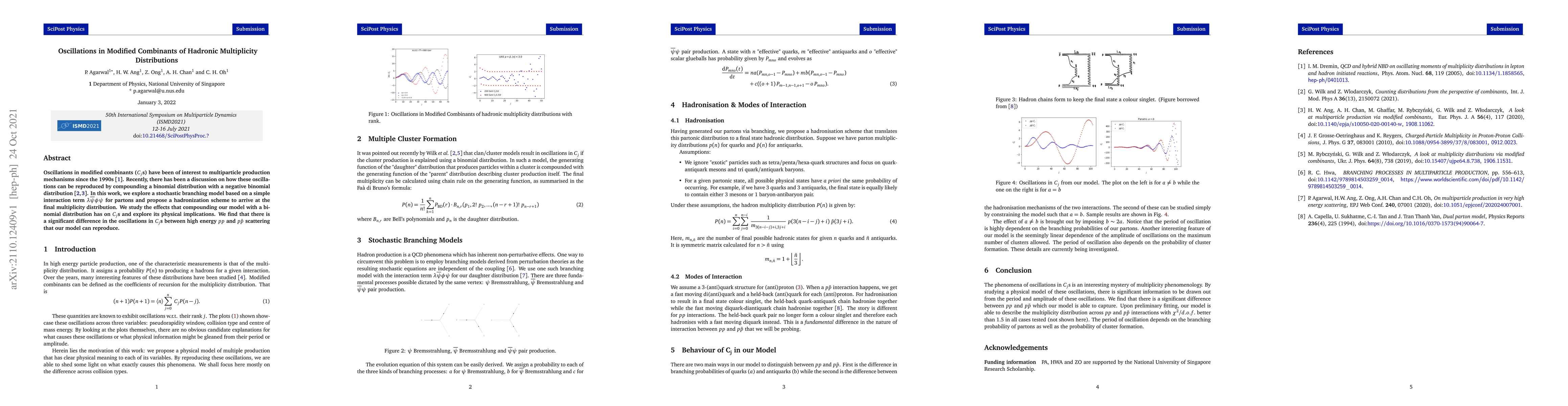 Oscillations in modified combinants ($C_j$s) have been of interest to multiparticle production mechanisms since the 1990s. Recently, there has been a discussion on how these oscillations can be reproduced by compounding a binomial distribution with a negative binomial distribution. In this work, we explore a stochastic branching model based on a simple interaction term $\lambda\overline{\psi}\phi\psi$ for partons and propose a hadronization scheme to arrive at the final multiplicity distribution. We study the effects that compounding our model with a binomial distribution has on $C_j$s and explore its physical implications. We find that there is a significant difference in the oscillations in $C_j$s between high energy $pp$ and $p\bar{p}$ scattering that our model can reproduce.