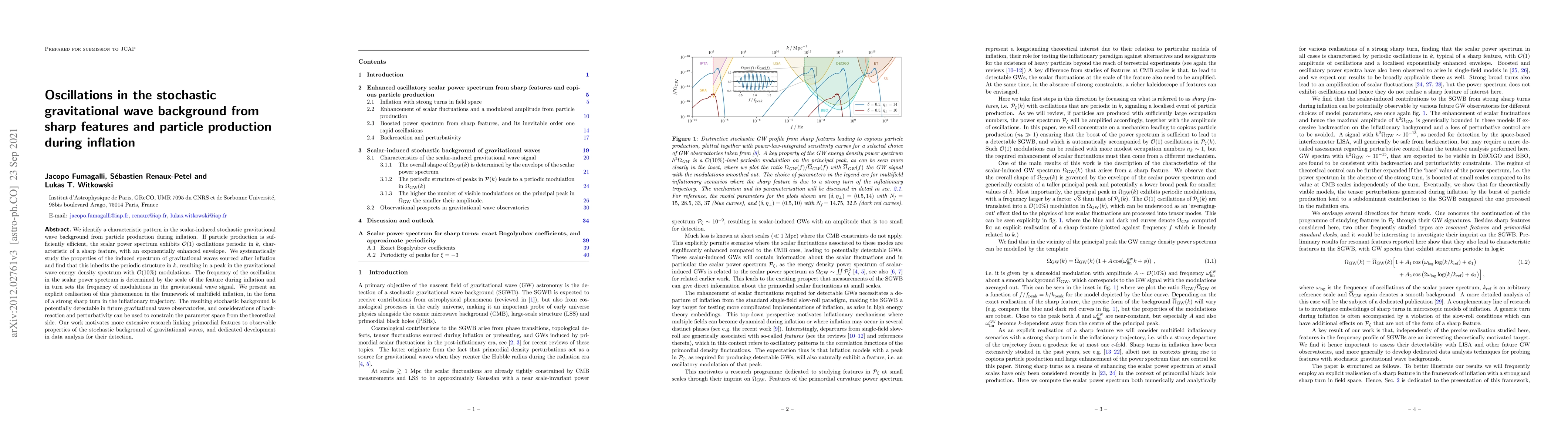 We identify a characteristic pattern in the scalar-induced stochastic gravitational wave background from particle production during inflation. If particle production is sufficiently efficient, the scalar power spectrum exhibits $\mathcal{O}(1)$ oscillations periodic in $k$, characteristic of a sharp feature, with an exponentially enhanced envelope. We systematically study the properties of the induced spectrum of gravitational waves sourced after inflation and find that this inherits the periodic structure in $k$, resulting in a peak in the gravitational wave energy density spectrum with $\mathcal{O}(10 \%)$ modulations. The frequency of the oscillation in the scalar power spectrum is determined by the scale of the feature during inflation and in turn sets the frequency of modulations in the gravitational wave signal. We present an explicit realisation of this phenomenon in the framework of multifield inflation, in the form of a strong sharp turn in the inflationary trajectory. The resulting stochastic background is potentially detectable in future gravitational wave observatories, and considerations of backreaction and perturbativity can be used to constrain the parameter space from the theoretical side. Our work motivates more extensive research linking primordial features to observable properties of the stochastic background of gravitational waves, and dedicated development in data analysis for their detection.