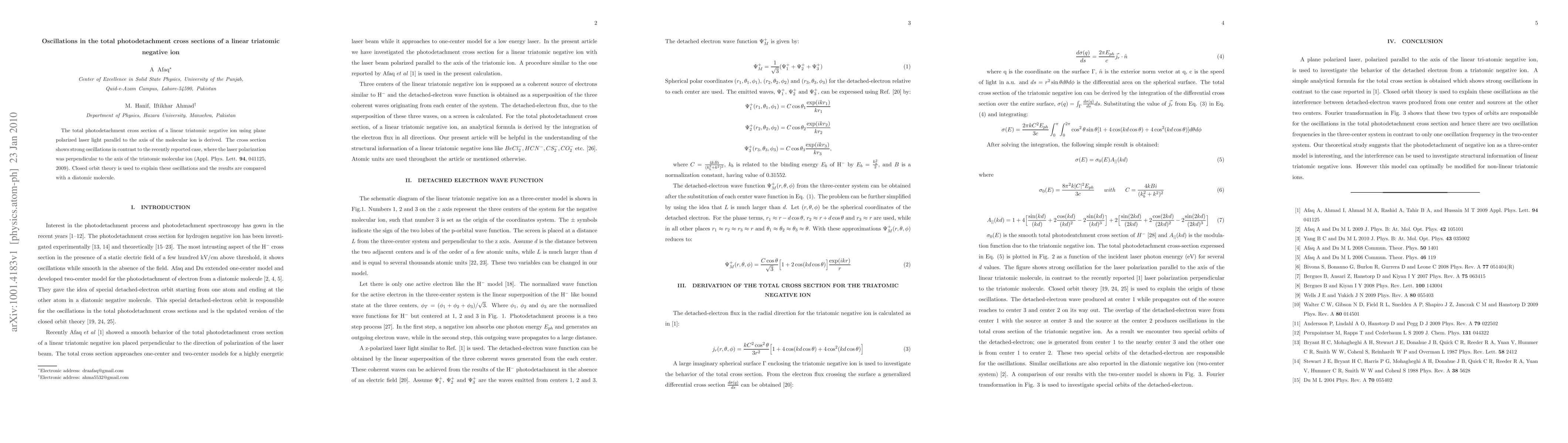 The research derives the total photodetachment cross section of a linear triatomic negative ion using plane-polarized laser light parallel to the molecular ion's axis, employing closed orbit theory for explanation and comparison with a diatomic molecule.