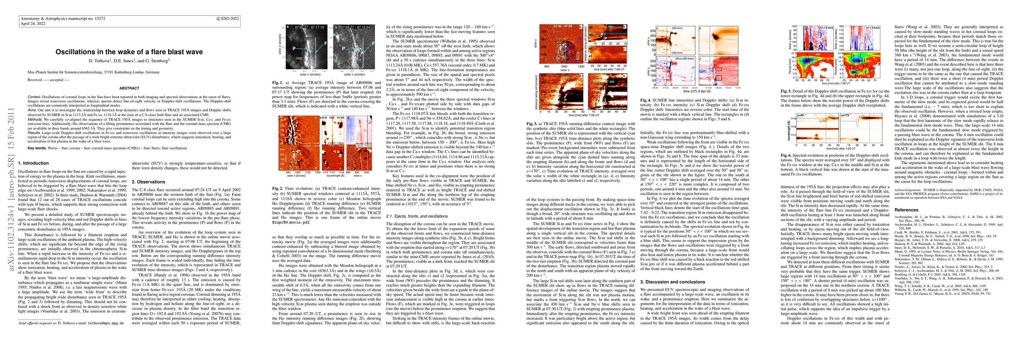 Oscillations of coronal loops in the Sun have been reported in both imaging and spectral observations at the onset of flares. Images reveal transverse oscillations, whereas spectra detect line-of-sight velocity or Doppler-shift oscillations. The Doppler-shift oscillations are commonly interpreted as longitudinal modes. Our aim is to investigate the relationship between loop dynamics and flows seen in TRACE 195\AA images and Doppler shifts observed by SUMER in Si III 1113.2\AA and Fe XIX 1118.1\AA at the time of a C.8-class limb flare and an associated CME. We carefully co-aligned the sequence of TRACE 195 \AA images to structures seen in the SUMER Si III, Ca X,and Fe XIX emission lines. Additionally, H-alpha observations of a lifting prominence associated with the flare and the coronal mass ejection (CME) are available in three bands around 6563.3 \AA . They give constraints on the timing and geometry. Large-scale Doppler-shift oscillations in Fe XIX and transverse oscillations in intensity images were observed over a large region of the corona after the passage of a wide bright extreme-ultraviolet (EUV) disturbance, which suggests ionization, heating, and acceleration of hot plasma in the wake of a blast wave.