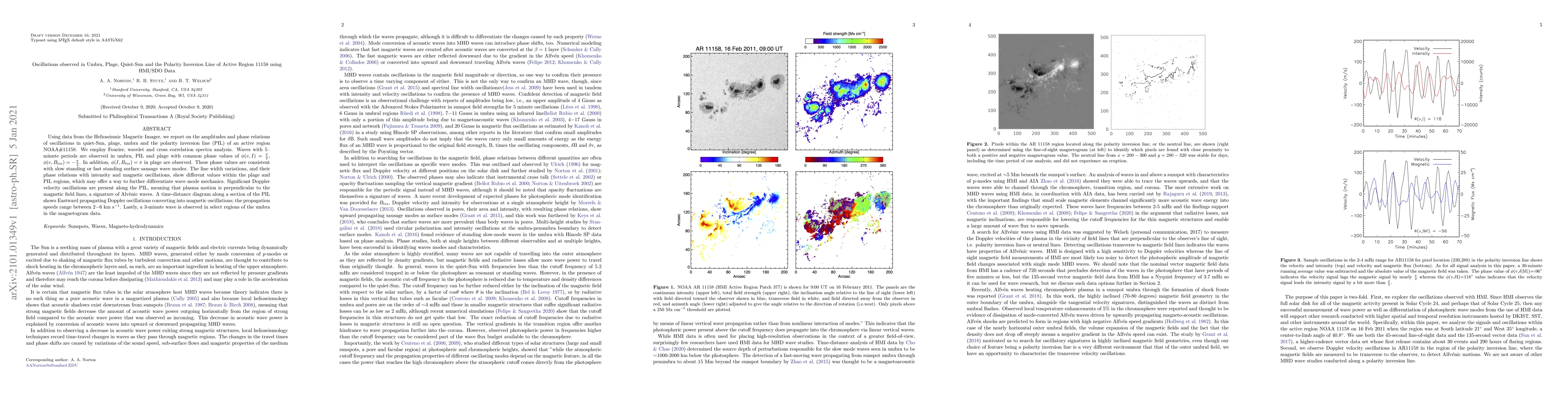This study uses HMI/SDO data to analyze oscillations in different regions of active region NOAA#11158, revealing 5-minute period waves with specific phase relations consistent with sausage wave modes. Significant Doppler velocity oscillations along the polarity inversion line indicate Alfvénic wave activity, with Eastward propagating oscillations converting into magnetic oscillations at speeds of 2–6 km s$^{-1}$.