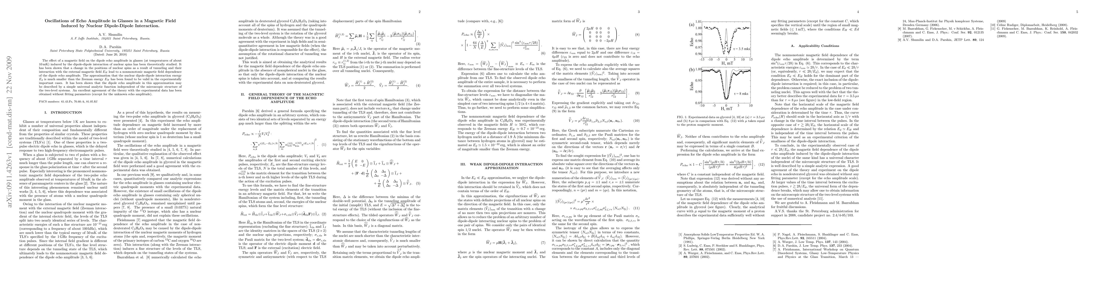 The effect of a magnetic field on the dipole echo amplitude in glasses (at temperatures of about 10 mK) induced by the dipole-dipole interaction of nuclear spins has been theoretically studied. It has been shown that a change in the positions of nuclear spins as a result of tunneling and their interaction with the external magnetic field E_H lead to a nonmonotonic magnetic field dependence of the dipole echo amplitude. The approximation that the nuclear dipole-dipole interaction energy E_d is much smaller than the Zeeman energy E_H has been found to be valid in the experimentally important cases. It has been shown that the dipole echo amplitude in this approximation may be described by a simple universal analytic function independent of the microscopic structure of the two-level systems. An excellent agreement of the theory with the experimental data has been obtained without fitting parameters (except for the unknown echo amplitude)