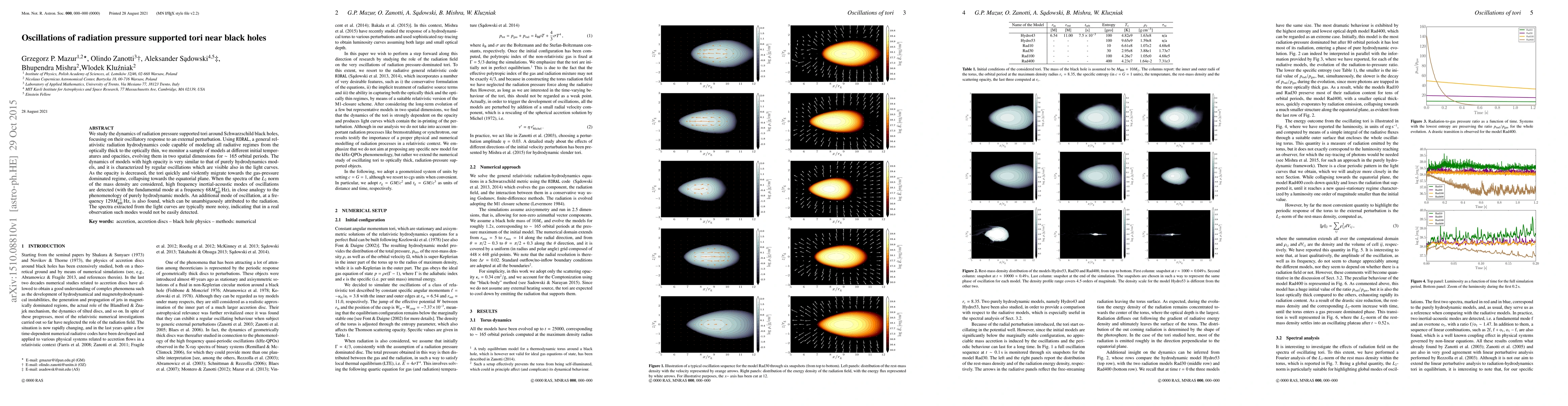 This paper investigates the oscillatory behavior of radiation pressure-supported tori around Schwarzschild black holes under external perturbations, revealing regular oscillations in high opacity models and violent collapse in low opacity models. High-frequency inertial-acoustic modes and a radiation-related mode are identified, though the latter is harder to detect in noisy light curves.