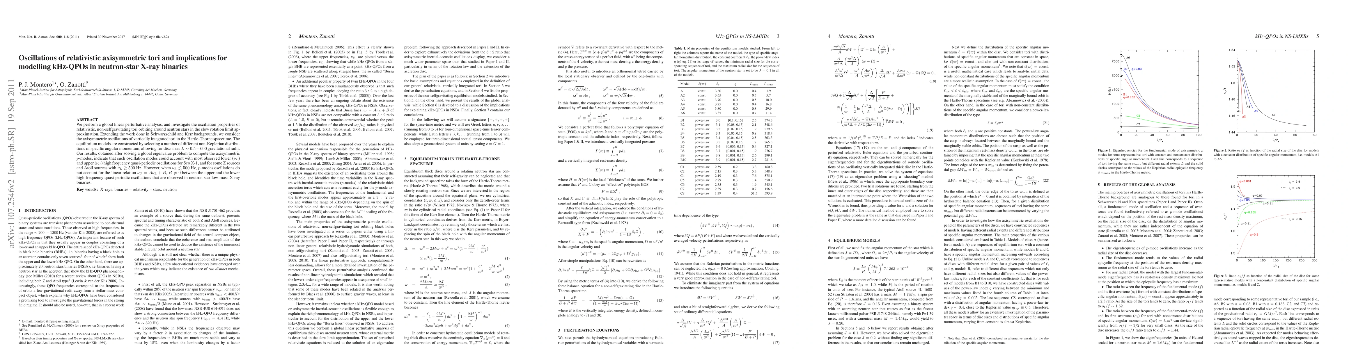 We perform a global linear perturbative analysis, and investigate the oscillation properties of relativistic, non-selfgravitating tori orbiting around neutron stars in the slow rotation limit approximation. Extending the work done in Schwarzschild and Kerr backgrounds, we consider the axisymmetric oscillations of vertically integrated tori in the Hartle-Thorne spacetime. The equilibrium models are constructed by selecting a number of different non-Keplerian distributions of specific angular momentum, allowing for disc sizes $L \sim 0.5 - 600$ gravitational radii. Our results, obtained after solving a global eigenvalue problem to compute the xisymmetric $p$-modes, indicate that such oscillation modes could account with most observed lower ($\nu_L$) and upper ($\nu_U$) high frequency quasi-periodic oscillations for Sco X-1, and for some Z sources and Atoll sources with $\nu_L\ gtrsim 500$ Hz. However, when $\nu_L \lesssim 500$ Hz, $p$-modes oscillations do not account for the linear relation $\nu_U = A \nu_L + B$, $B \neq 0$ between the upper and the lower high frequency quasi-periodic oscillations that are observed in neutron star low-mass X-ray binaries.