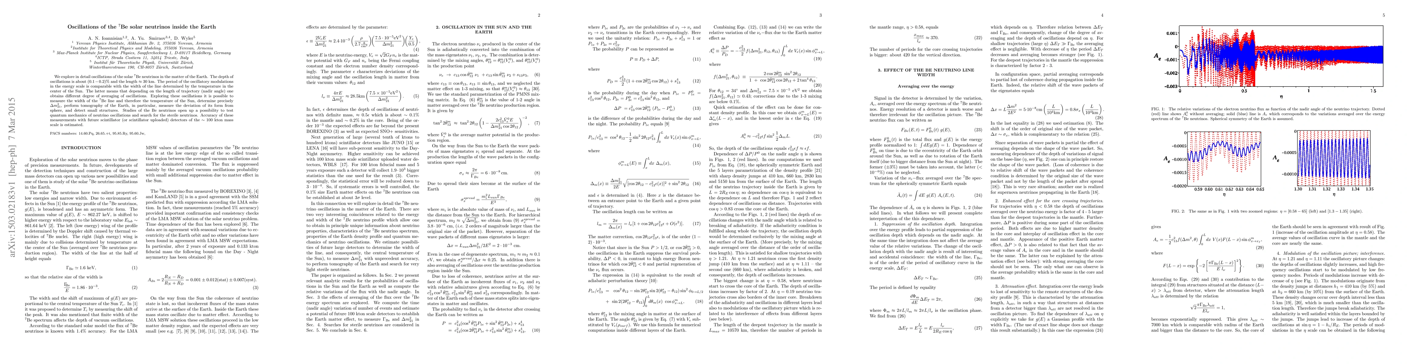 This paper investigates the oscillations of $^7$Be neutrinos from the Sun as they travel through the Earth, revealing a depth of oscillation of about $(0.1 - 0.2)\%$ and a length of $\approx 30$ km. The study suggests that these oscillations could be used to measure the Sun's core temperature, determine $\Delta m^2_{21}$, and perform Earth tomography, while also offering potential tests for quantum mechanics and sterile neutrinos.